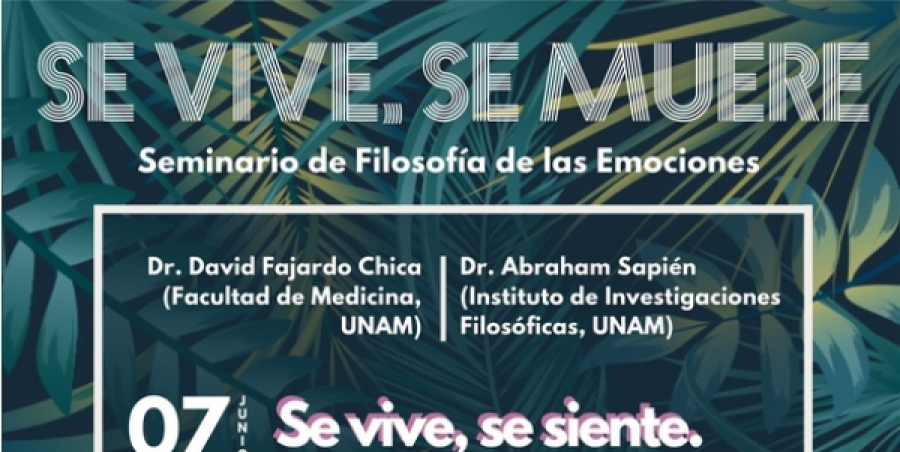 La próxima semana, del 07 al 10 de junio, los doctores David Fajardo Chica (Departamento de Psiquiatría y Salud Mental, UNAM) y Abraham Sapién (Instituto de Investigaciones Filosóficas, UNAM) dictarán un seminario sobre emociones titulado "Se vive, se muere" dirigido a la comunidad vallecaucana en general. A quien asista a las cuatro sesiones se le otorgará una constancia de asistencia.