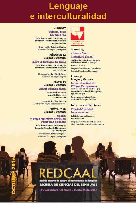 La Red de Centros de apoyo al aprendizaje de lenguas, REDCAAL, de la Escuela de Ciencias del Lenguaje de la Universidad del Valle, invita a su programación del mes de octubre y noviembre bajo el lema Lenguaje e interculturalidad.