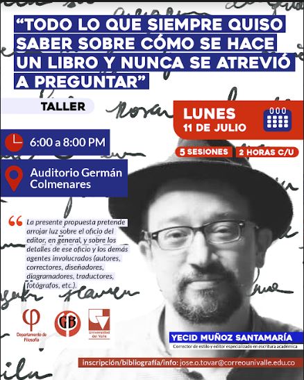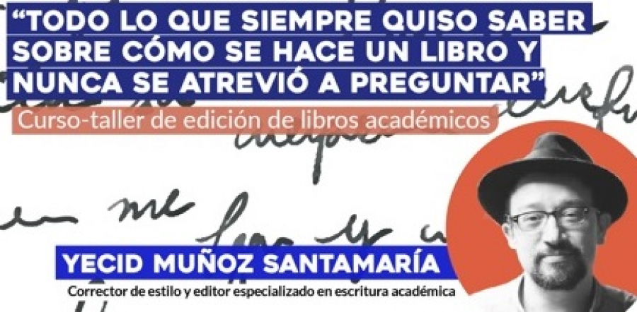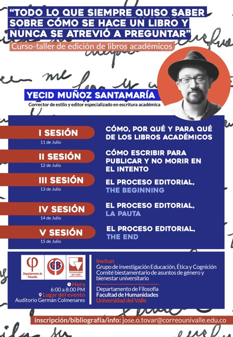 ¿Le interesa el mundo editorial? El curso-taller de edición de libros académicos es la oportunidad para entrar en el apasionante campo de la edición académica. En cinco sesiones el participante tendrá el acompañamiento de Yecid Muñoz Santamaría, profesional en el área. Este evento es organizado por el grupo de investigación Educación, Ética y Cognición, a través de su proyecto "Cognición, emociones y gramática" (C.I.412) en conjunto con el Comité biestamentario de asuntos de género y bienestar universitario. La inscripción al curso-taller y la participación son gratuitas. Escribir a Esta dirección de correo electrónico está siendo protegida contra los robots de spam. Necesita tener JavaScript habilitado para poder verlo.