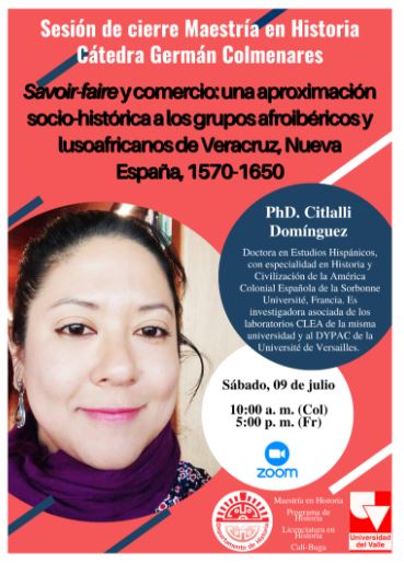 El Departamento de Historia de la Universidad del Valle se complace en invitarlos a la Sesión de cierre de la Maestría en Historia/Cátedra Germán Colmenares. En esta ocasión se contará con la participación de la investigadora Citlalli Domínguez, doctora en Estudios Hispánicos con especialidad en Historia y Civilización de la América Colonial Española de la Sorbonne Université, Francia; con su conferencia titulada: 'Savoir-faire y comercio: una aproximación socio-histórica a los grupos afroibéricos y lusoafricanos de Veracruz en Nueva España, 1570-1650'.