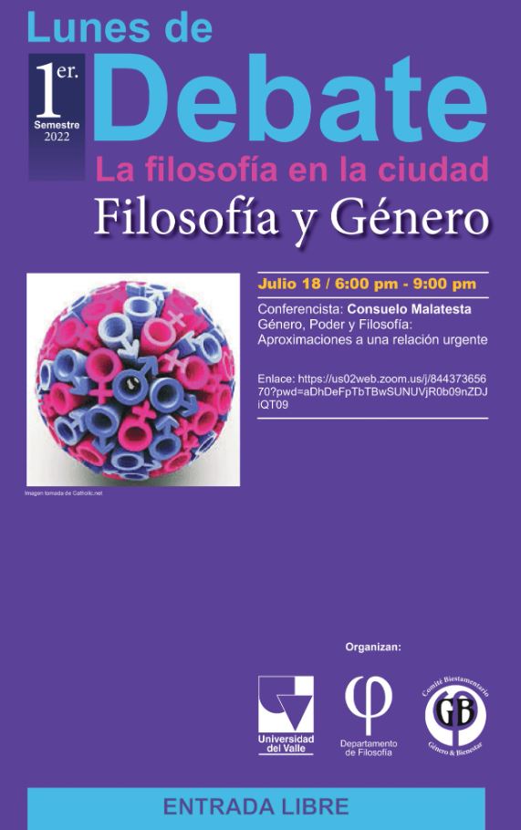 ¡Filosofía y Género! última sesión de Lunes de Debate: la filosofía en la ciudad, organizado por el Departamento de Filosofía de la Universidad del Valle y su Comité Biestamentario de Género y Bienestar. En esta ocasión la invitada especial es Consuelo Malatesta, socióloga de la Universidad del Valle y consultora en género, educación y políticas públicas, con quien conversaremos de género, poder y filosofía. ¡No te lo pierdas!