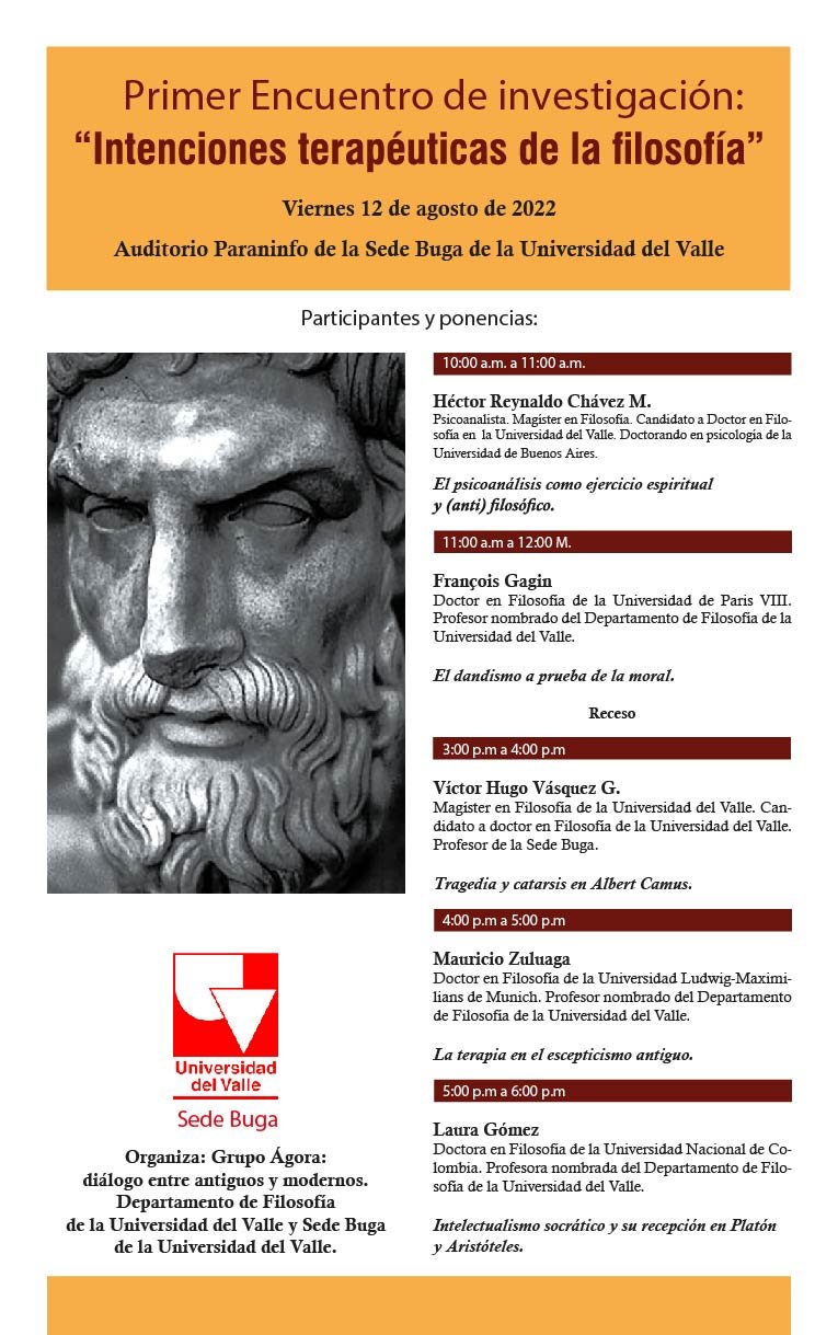 El Departamento de Filosofía, la Maestría en Filosofía Sede Buga y el grupo de investigación Ágora: diálogo entre antiguos y modernos, les extiende una invitación especial a participar de su Primer Encuentro de Investigación. Este evento es producto de la investigación titulada “Intenciones terapéuticas de la filosofía”, que el grupo Ágora adelanta, aprobada por Vicerrectoría de Investigación, en el marco de la convocatoria interna 132-2021.