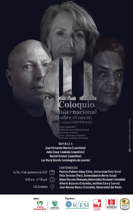 La Escuela de Estudios Literarios de la Universidad del Valle tiene el agrado de informar que el II Coloquio Internacional sobre el Cuento Latinoamericano se efectuará en la ciudad de Cali, del 14 al 16 de septiembre de 2022, en las tres universidades organizadoras (Icesi, Autónoma de Occidente y del Valle) y en la Biblioteca Departamental Jorge Garcés Borrero. Este II Coloquio Internacional cuenta con el apoyo del Plan Valle Invencible de la Gobernación del Valle del Cauca.