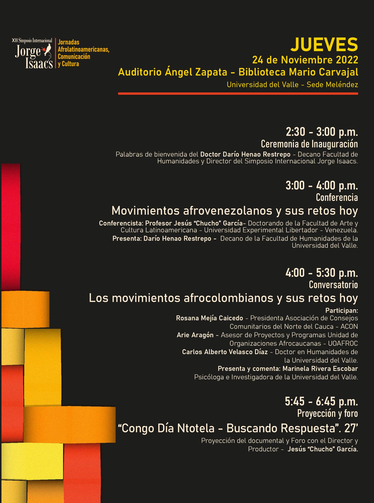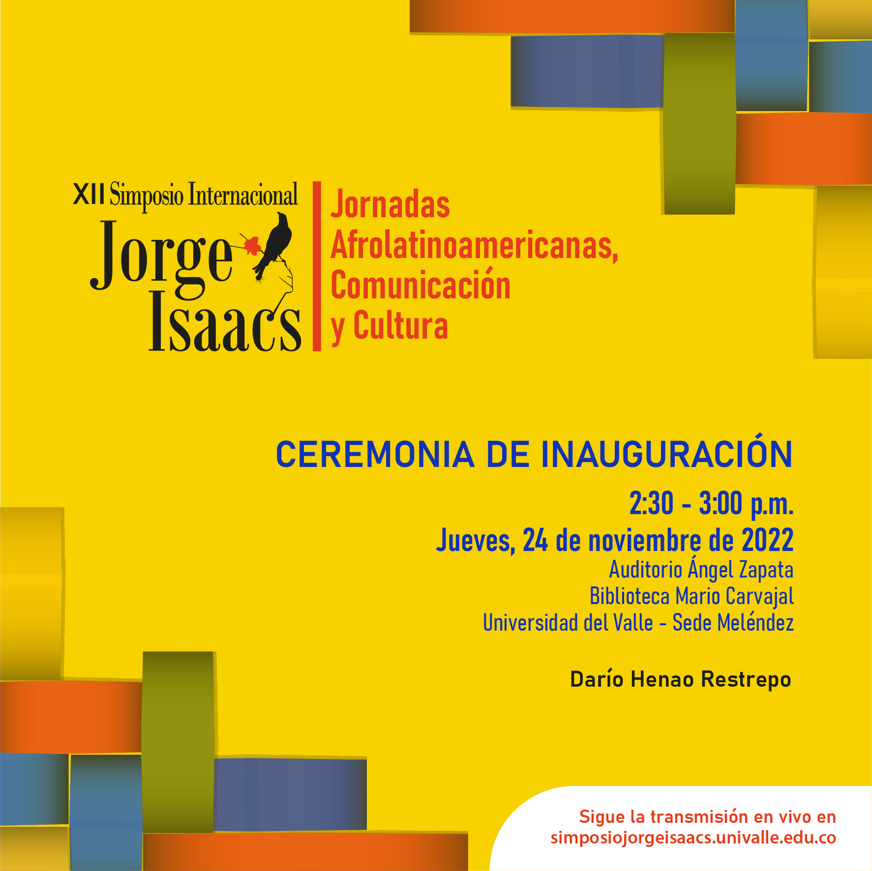 Están cordialmente invitados a la ceremonia de inauguración del XII Simposio Internacional Jorge Isaacs: Jornadas Afrolatinoamericanas, Comunicación y Cultura. La actividad académica y cultural se realizará en el Auditorio Ángel Zapata (Biblioteca Mario Carvajal, sede Meléndez) desde las 2:30 p.m. Después de la clausura se tendrán varias conferencias. A continuación pueden consultar la programación para hoy jueves 24 de noviembre. Toda la programación del evento y el seguimiento vía streaming lo pueden hacer por https://simposiojorgeisaacs.univalle.edu.co/