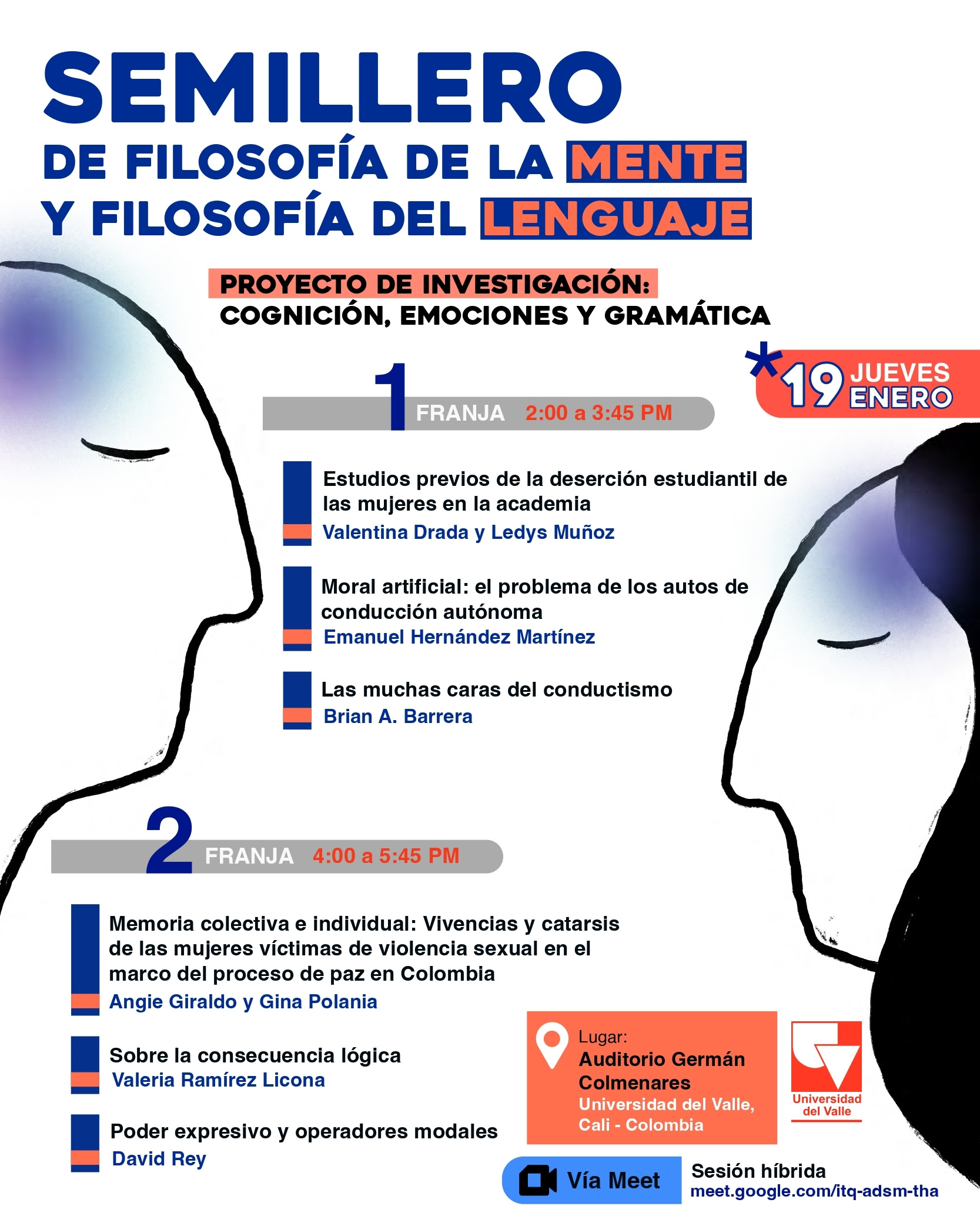 El Departamento de Filosofía los invita cordialmente a la sesión de presentación de avances de investigación del Semillero de Filosofía de la Mente y Filosofía del Lenguaje. La sesión tendrá lugar el jueves 19 de enero. Será una sesión híbrida. Los asistentes podrán escuchar las charlas presencialmente o podrán conectarse por Google Meet. En el afiche adjunto podrán consultar la programación.