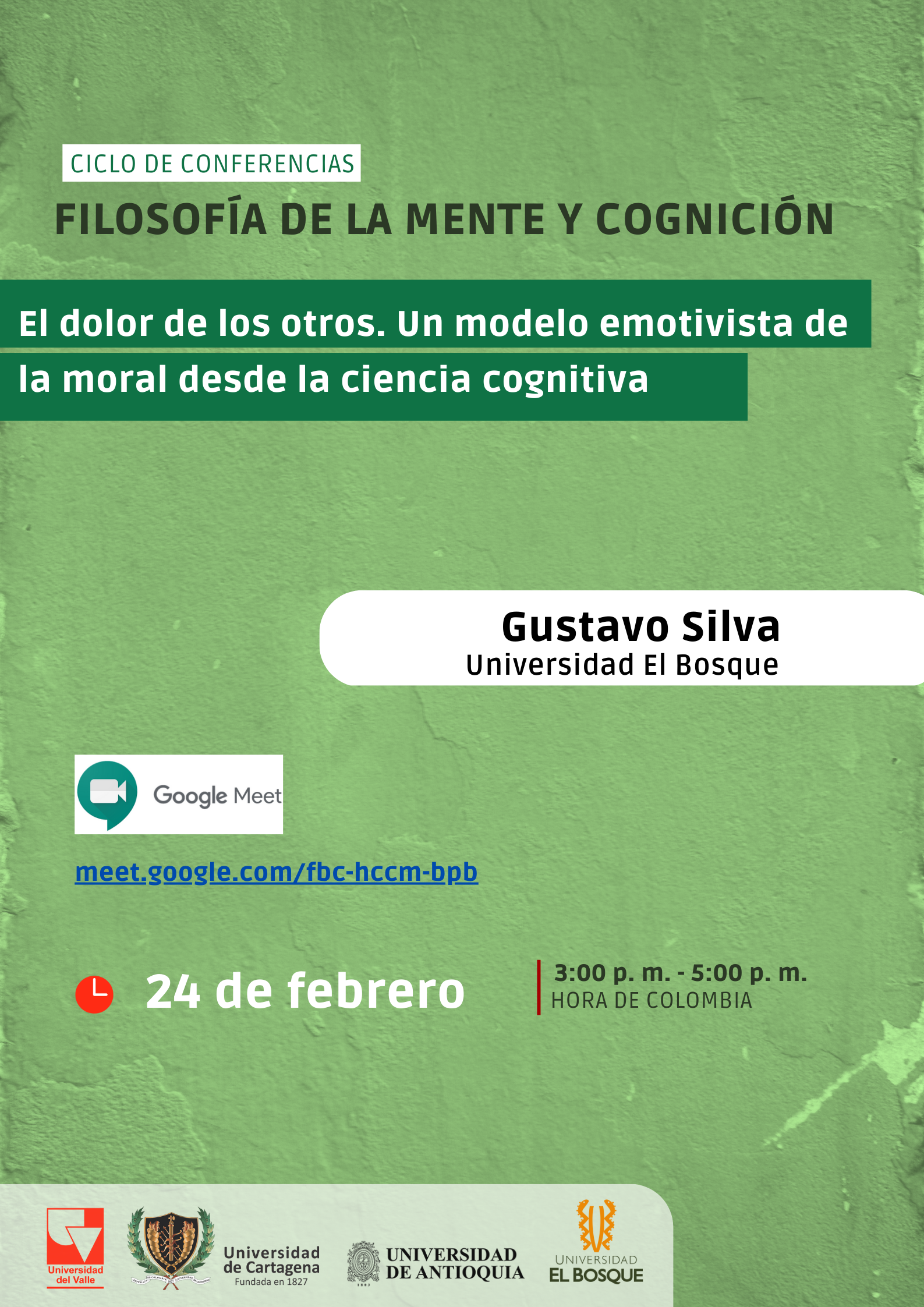 Se reanuda el ciclo Filosofía de la mente y cognición. La primera conferencia de este año se llevará a cabo este viernes 24 de febrero de las 3:00 p.m. a las 5:00 p.m. (hora de Colombia). En esta ocasión, el conferencista será el profesor Gustavo Silva de la Universidad El Bosque. Su conferencia se titula «El dolor de los otros. Un modelo emotivista de la moral desde la ciencia cognitiva.». Gustavo Silva (Universidad El Bosque) Resumen: Propongo que la formación de juicios morales se da a partir de la percepción de daño hacia una diversidad de entidades morales, mediante una plantilla cognitiva que la evolución de nuestra especie ha perfeccionado. Este modelo presenta características relacionadas con la teoría emotivista contemporánea de la moral, deudora del emotivismo escocés del siglo XVIII. Según esta perspectiva, el mal moral (o el mismo bien moral) es algo que depende de la reacción intuitiva y afectiva que tenemos cuando percibimos una situación; en este caso el daño fáctico a una entidad que suponemos le ha sido producido intencionalmente. Es la intuición la que hace que esa situación sea para nosotros reprochable negativamente.