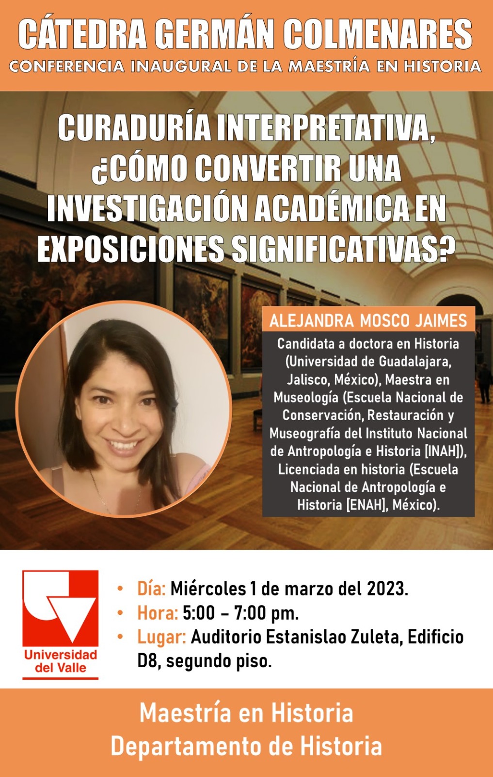 El Departamento de Historia de la Universidad del Valle se complace en invitarlos a la conferencia inaugural de la Maestría en Historia. En esta ocasión se contará con la participación de la investigadora Alejandra Mosco Jaimes, Magíster en Museología de la Escuela Nacional de Conservación, Restauración y Museografìa del Instituto Nacional de Antropología e Historia (INAH) y Licenciada en Historia de la Escuela Nacional de Antropología e Historia, México. Su conferencia se titula "Curaduría Interpretativa, ¿Cómo convertir una investigación académica en exposiciones significativas?"