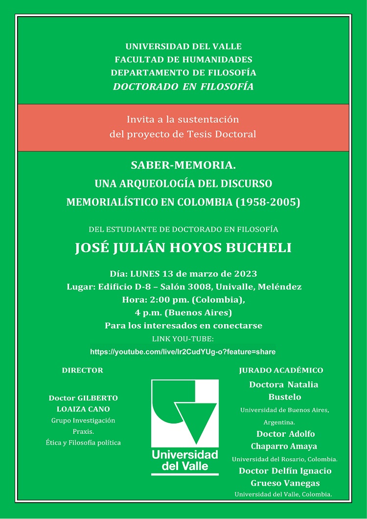 El Doctorado en Filosofía del Departamento de Filosofía de la Facultad de Humanidades de la Universidad del Valle invita a la sustentación del proyecto de tesis doctoral "Saber-Memoria. Una arqueología del discurso memorialístico en Colombia (1958-2005)" del estudiante José Julián Hoyos Bucheli. La actividad académica será el lunes 13 de marzo de 2023. Edificio D-8 Salón 3008, sede Meléndez de la Universidad del Valle. 4:00 p.m.