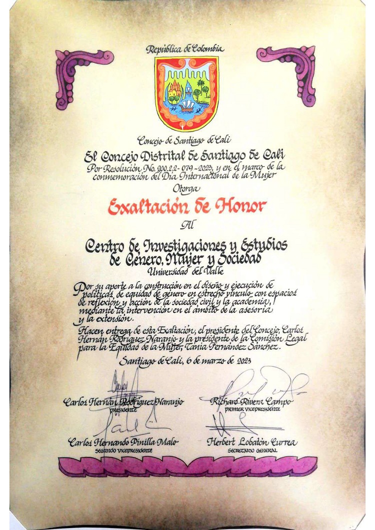 El martes 8 de marzo de 2023, el Centro de Investigaciones y Estudios de Género, Mujer y Sociedad -CIEGMS- de la Universidad del Valle recibió una exaltación por parte del Concejo Municipal de Cali, en el marco de la conmemoración del 8 de marzo, Día Internacional de la Mujer Trabajadora. Este reconocimiento exalta el trabajo y los aportes del CIEGMS en el diseño y ejecución de políticas de equidad de género, en estrecho vínculo con espacios de reflexión y acción de la sociedad civil y la academia, mediante la intervención a nivel de asesoría y extensión.
