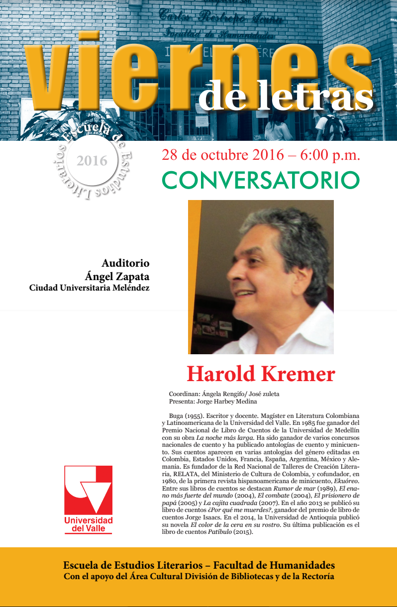 La Escuela de Estudios Literarios con el apoyo financiero de la Rectoría y el Área Cultural División de Bibliotecas invitan a toda la comunidad al conversatorio el docente y escrito Harold Kremer quien nos acompañará el viernes 28 de octubre en el marco del programa Viernes de Letras 2016.