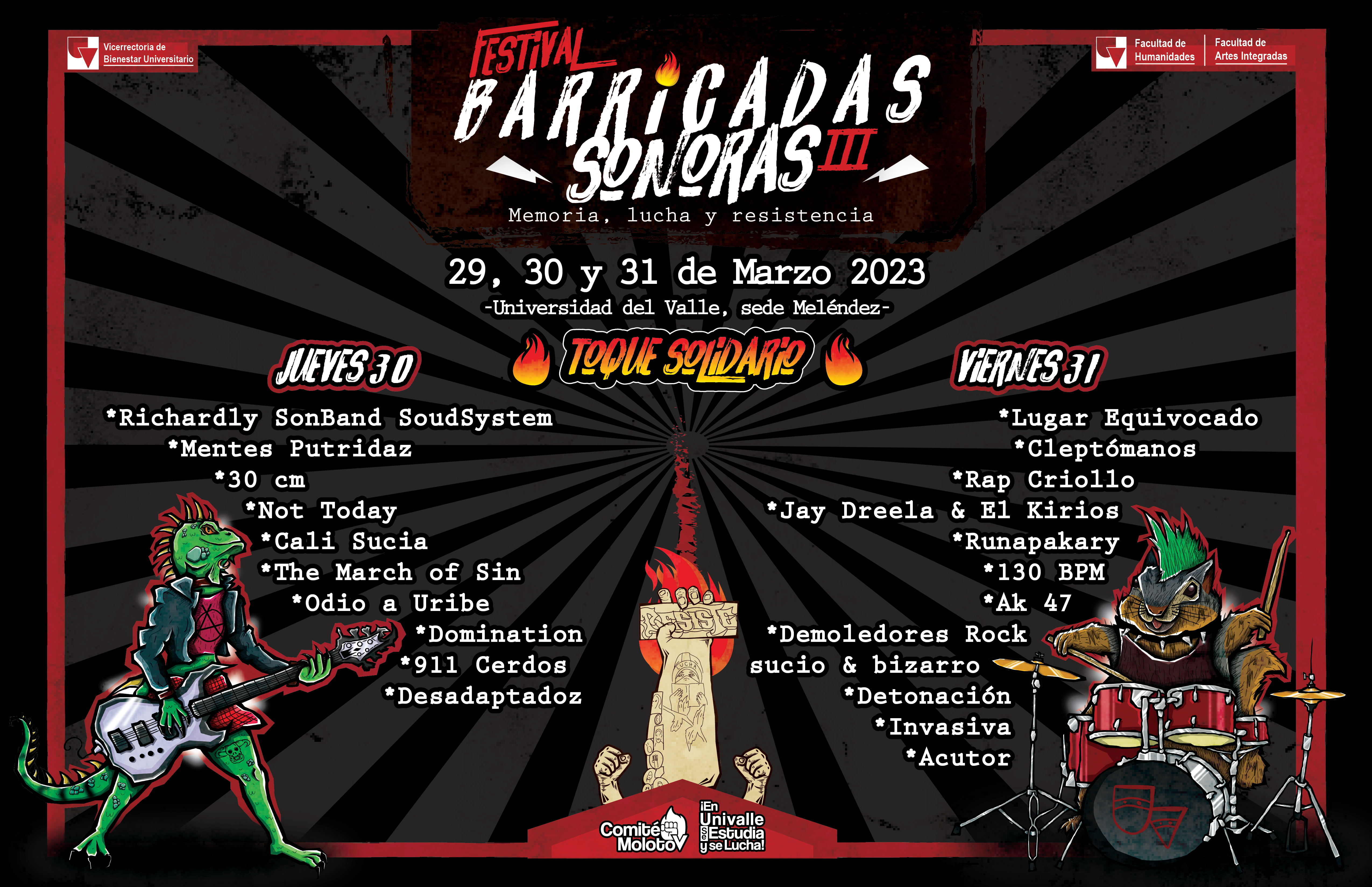 El colectivo estudiantil Comité Molotov, con el apoyo de la Facultad de Humanidades y la Vicerrectoría de Bienestar Universitario realizarán El Festival Estudiantil Barricadas Sonoras III “Memoria, lucha y resistencia”, entre el 29 y 31 de marzo de 2023, en el campus de Meléndez.