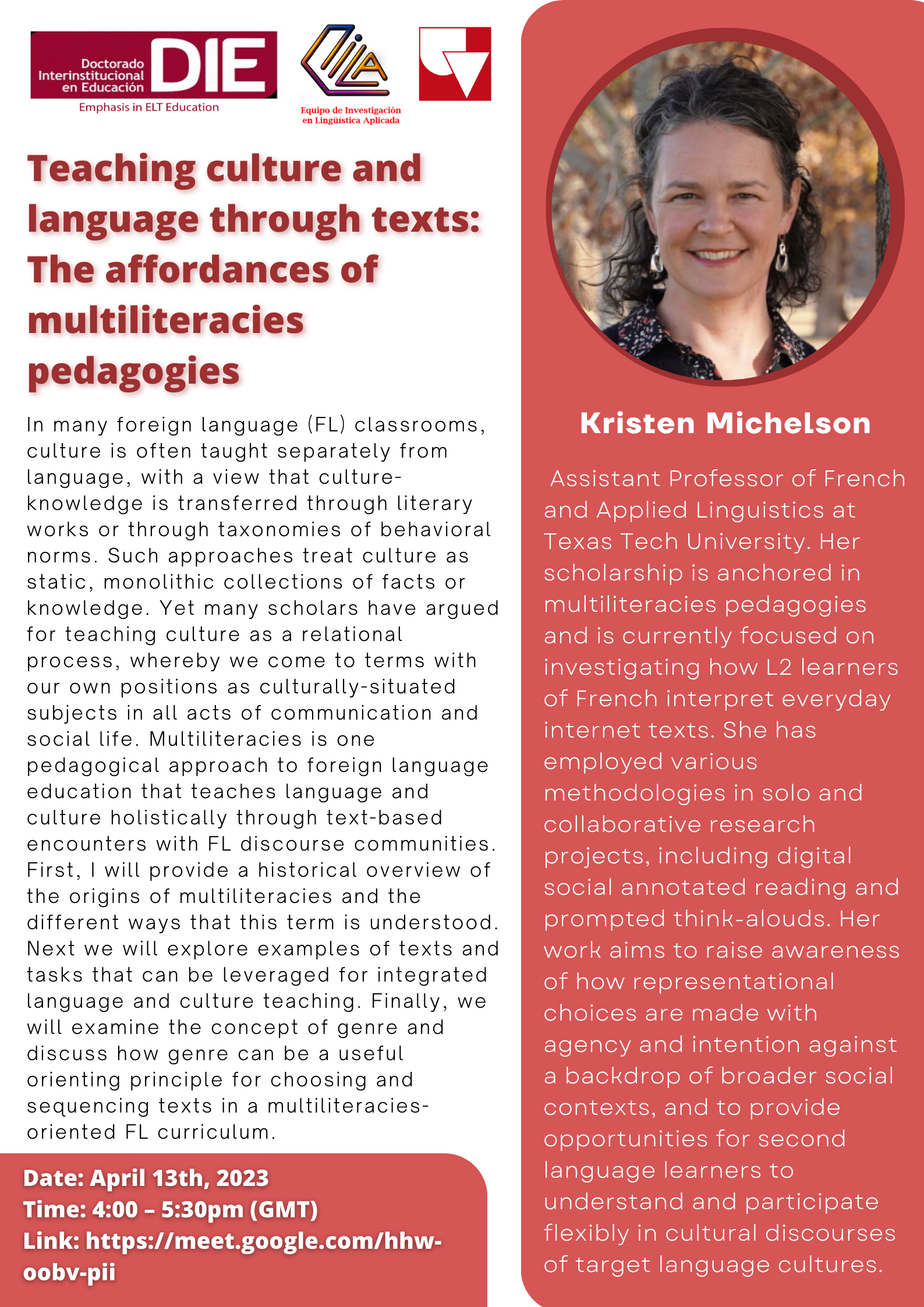 La Escuela de Ciencias del Lenguaje de la Facultad de Humanidades de la Universidad del Valle tiene el Gusto de invitar a la siguiente Professional & Academic Development Series (PADS) organizada por el Doctorado Interinstitucional en Educación y el grupo de investigación EILA. En esta ocasión la invitada es Kristen Michelson, Profesora asistente de Francés y Lingüística aplicada en la Texas Tech University.