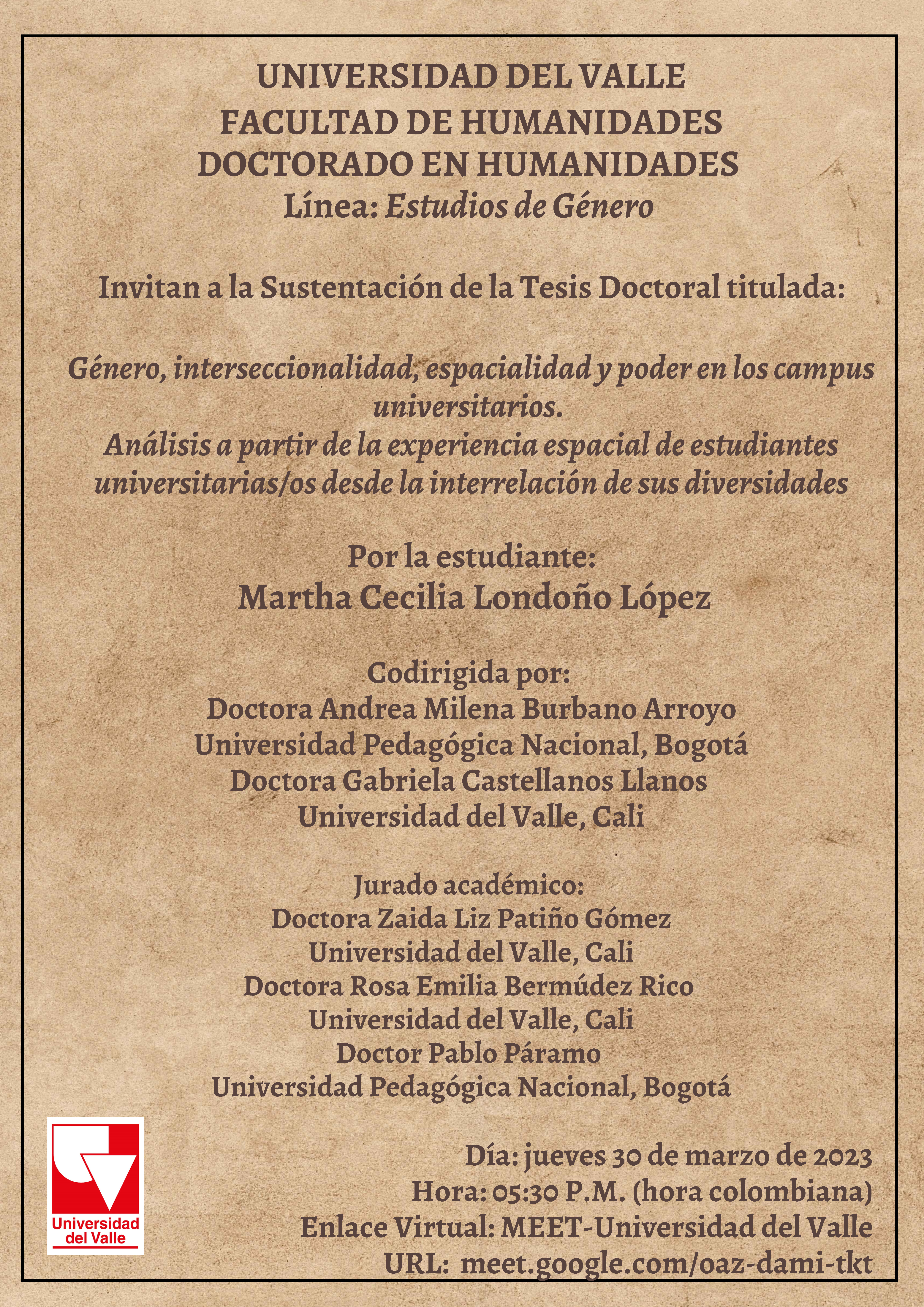 El Doctorado en Humanidades de la Facultad de Humanidades de la Universidad del Valle tienen el gusto de invitarles a la sustentación de la Tesis Doctoral Género, interseccionalidad,espacialidad y poder en los campus universitarios. Análisis a partir de la experiencia espacial de estudiantes universitarias/os desde la interrelación de sus diversidades de la estudiante Martha Cecilia Londoño López.