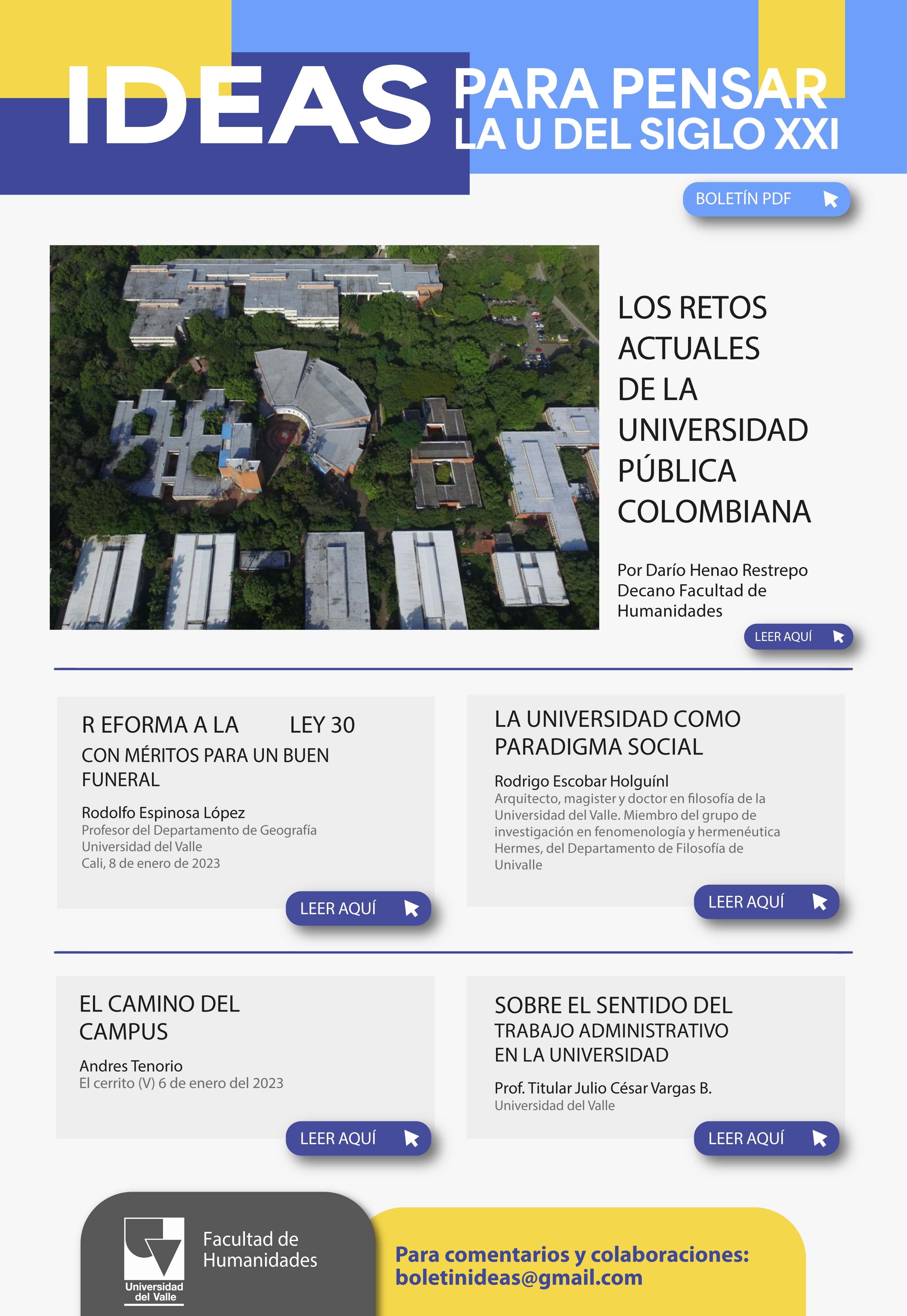 Compartimos el Boletín Ideas para Pensar la U del Siglo XXI, de la Facultad de Humanidades de la Universidad del Valle. En esta edición presentamos los artículos: