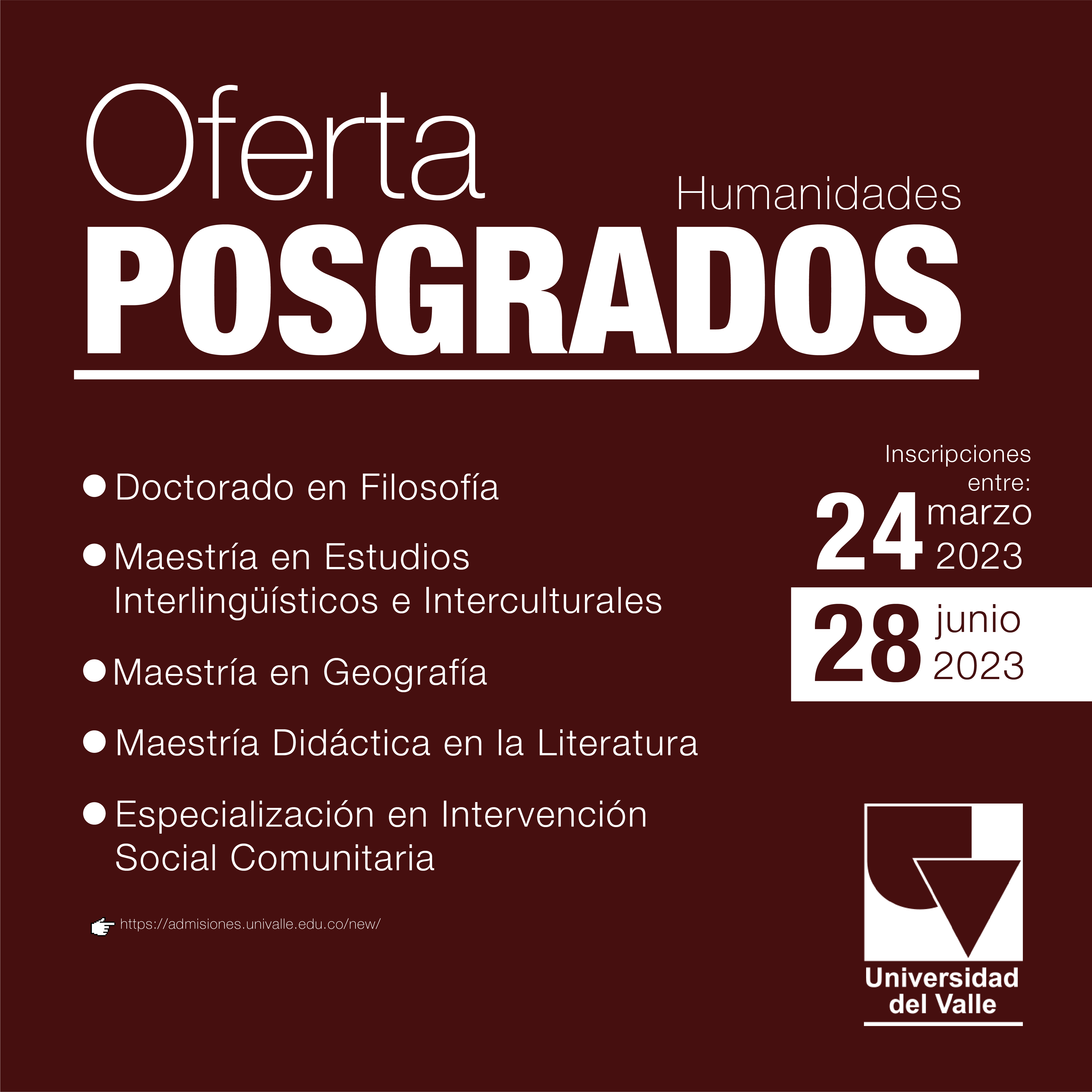 La Facultad de Humanidades de la Universidad del Valle se complace en anunciar que desde el 24 de marzo se encuentran abiertas las inscripciones a los siguientes programas de posgrado en nuestra facultad: Doctorado en Filosofía, Maestría en Didáctica de la Literatura, Maestría en Geografía, Maestría en Estudios Interlingüísticos y Especialización en Intervención Comunitaria.