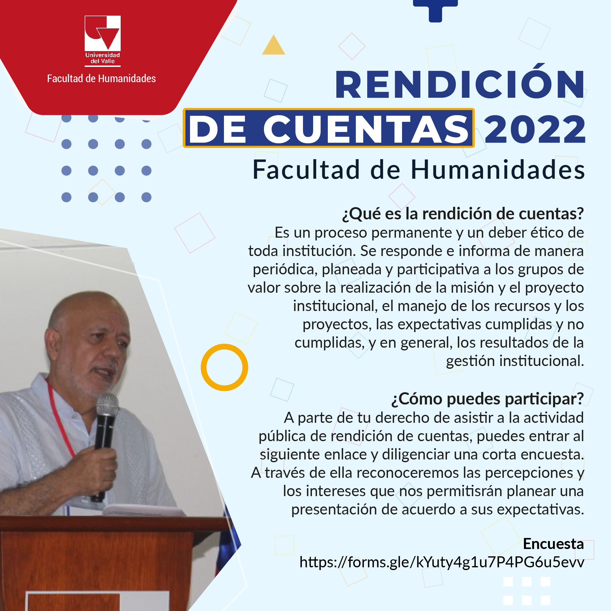 La Facultad de Humanidades de la Universidad del Valle realizará la actividad Rendición Pública de Cuentas Año 2022 este 10 de mayo a las 10:00 a.m. en el Auditorio Germán Colmenares del Edificio D-10. Como método de consulta y preparación para este evento, la facultad ha propuesto una encuesta a través de un formulario de Google. Todos los miembros de la Facultad están invitados a completarla y participar activamente de este proceso de Rendición de cuentas 2022. También, lo invitamos a consultar el Informe de Gestión de la Facultad de Humanidades Año 2022.