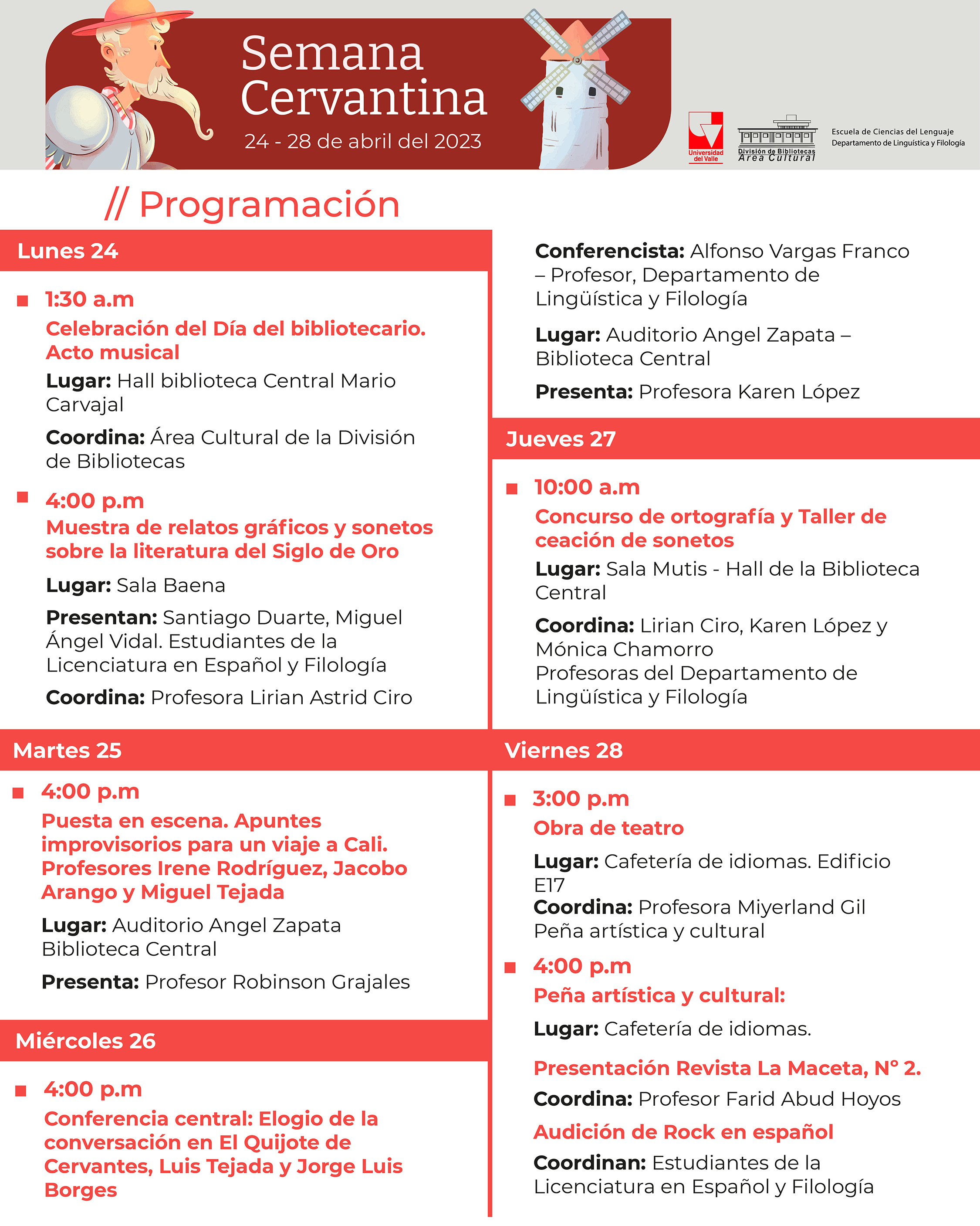 El Departamento de Lingüística y Filología de la Escuela de Ciencias del Lenguaje de la Facultad de Humanidades y la Biblioteca Central Mario Carvajal de la Universidad del Valle se alegran de invitar a toda la comunidad Univalluna a participar de la Semana Cervantina 2023. Este evento se realiza cada año en ocasión de la celebración del Día del idioma español, el 23 de abril. La programación de este año ofrece diversas actividades académicas y culturales que giran en torno a La proyección del español en las artes, las letras y la ciencias.
