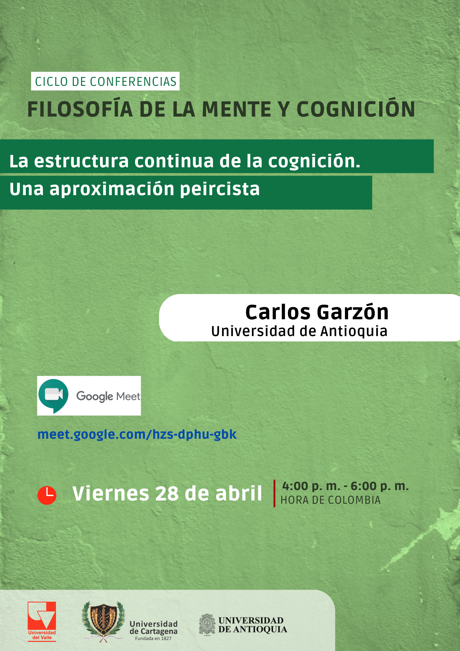 Nos complace informarles que la próxima conferencia del ciclo Filosofía de la mente y cognición se llevará a cabo este viernes 28 de abril de las 4:00 p.m. a las 6:00 p.m. (hora de Colombia). En esta ocasión, el conferencista será nuestro colega Carlos Garzón de la Universidad de Antioquia. Su conferencia se titula «La estructura continua de la cognición. Una aproximación peircista».