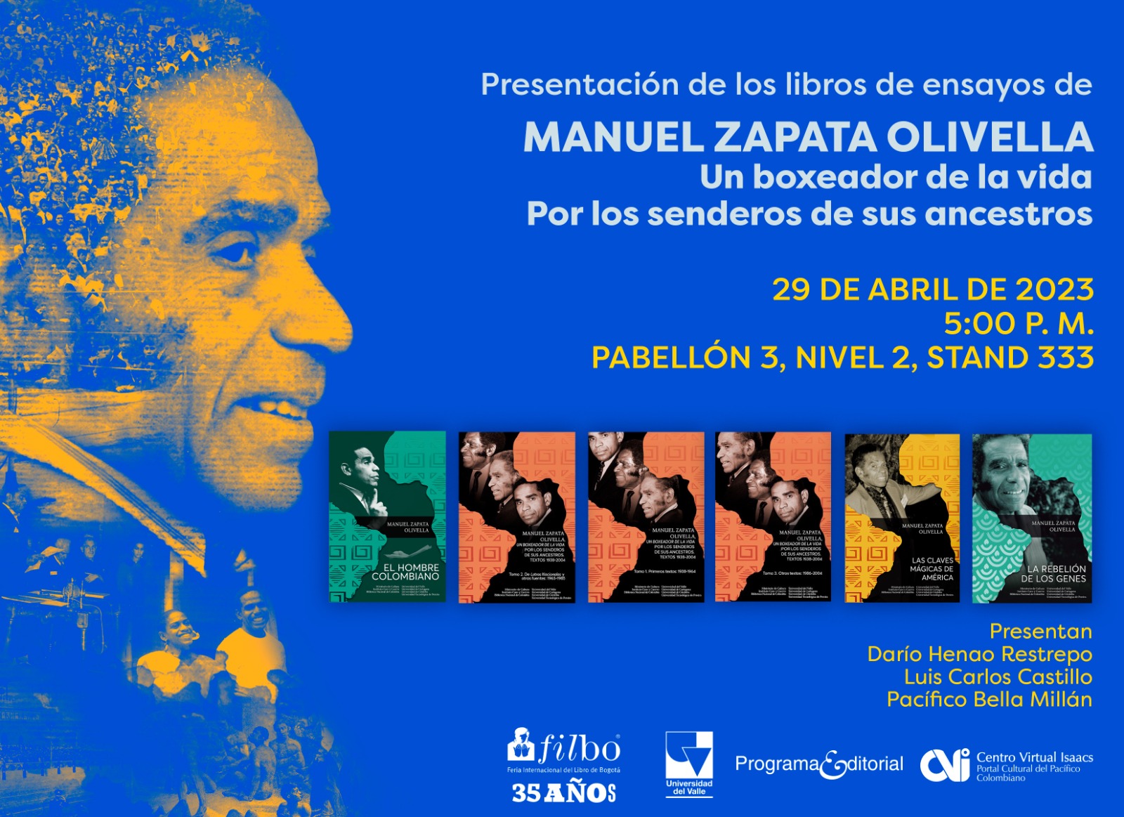 En el marco de la Feria Internacional del Libro de Bogotá 2023 el decano de la Facultad de Humanidades de la Universidad del Valle, Dr. Darío Henao, estará presentando los libros de ensayos escritos por Manuel Zapata Olivella. De la presentación harán parte también el profesor de la Facultad de Ciencias Sociales y Económicas de la Universidad del Valle Dr. Luis Carlos Castillo y Pacífico Bella Millán, profesional del Centro Virtual Isaacs de la Universidad del Valle.