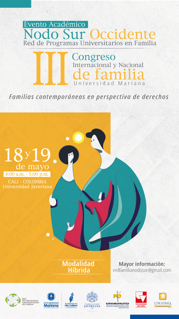 Reciban un cordial saludo de la Escuela de Trabajo Social y Desarrollo Humano de la Facultad de Humanidades de la Universidad del Valle. Tenemos el gusto de invitarles al Evento académico que realizará el Nodo Suroccidente de la Red Nacional de Programas Universitarios en Familia, del cual hacemos parte, y al III Congreso Internacional y Nacional de Familia de la Universidad Mariana denominado “FAMILIAS CONTEMPORÁNEAS EN PERSPECTIVA DE DERECHOS”.