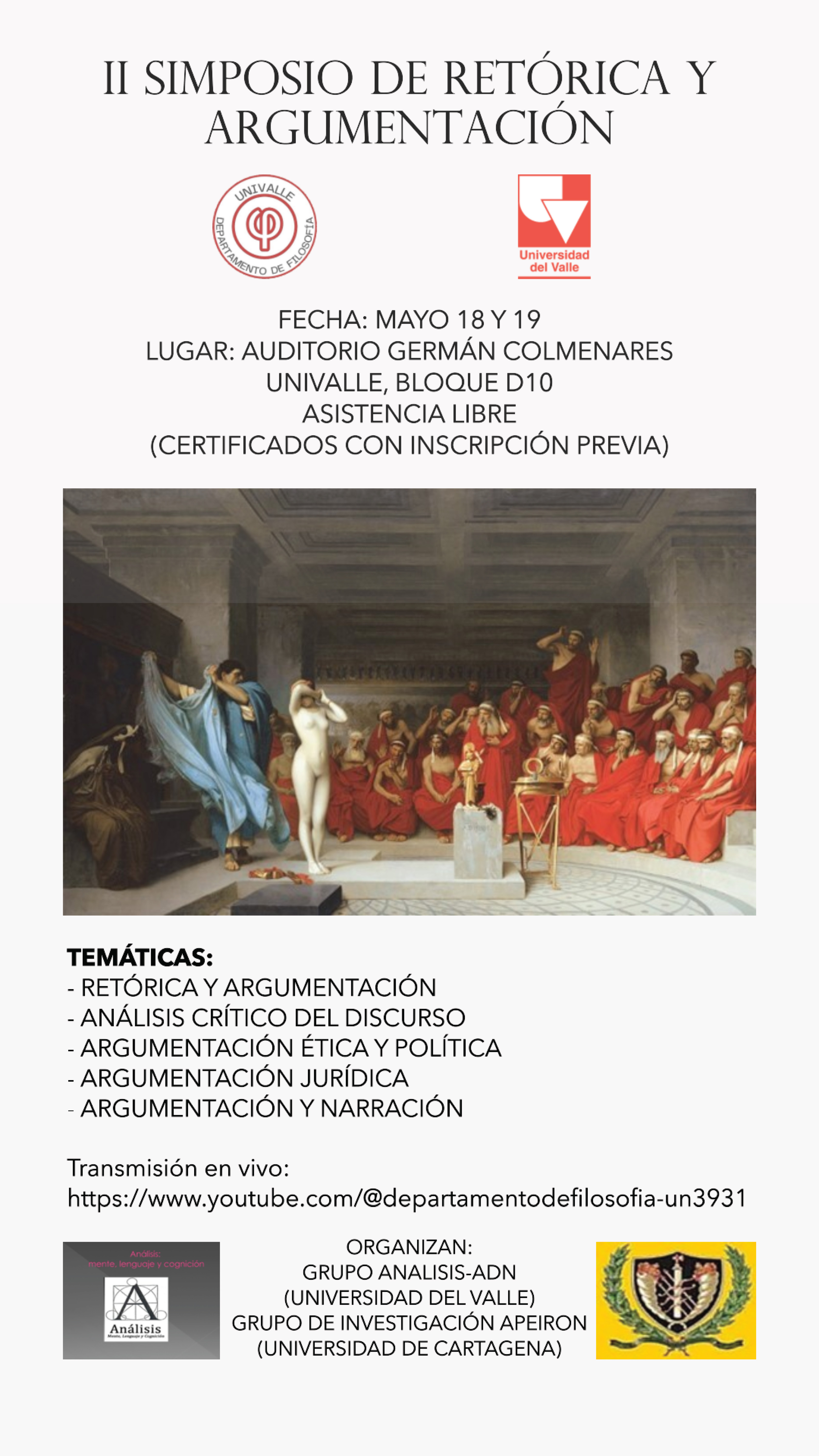 El Departamento de Filosofía de la Facultad de Humanidades de la Universidad del Valle se complace en invitar a la comunidad univalluna al II Simposio de Retórica y Argumentación que tendrá lugar este 18 y 19 de mayo en el auditorio Germán Colmenares (edificio D10). La asistencia es libre, pero solo se entregan certificados con inscripción previa.