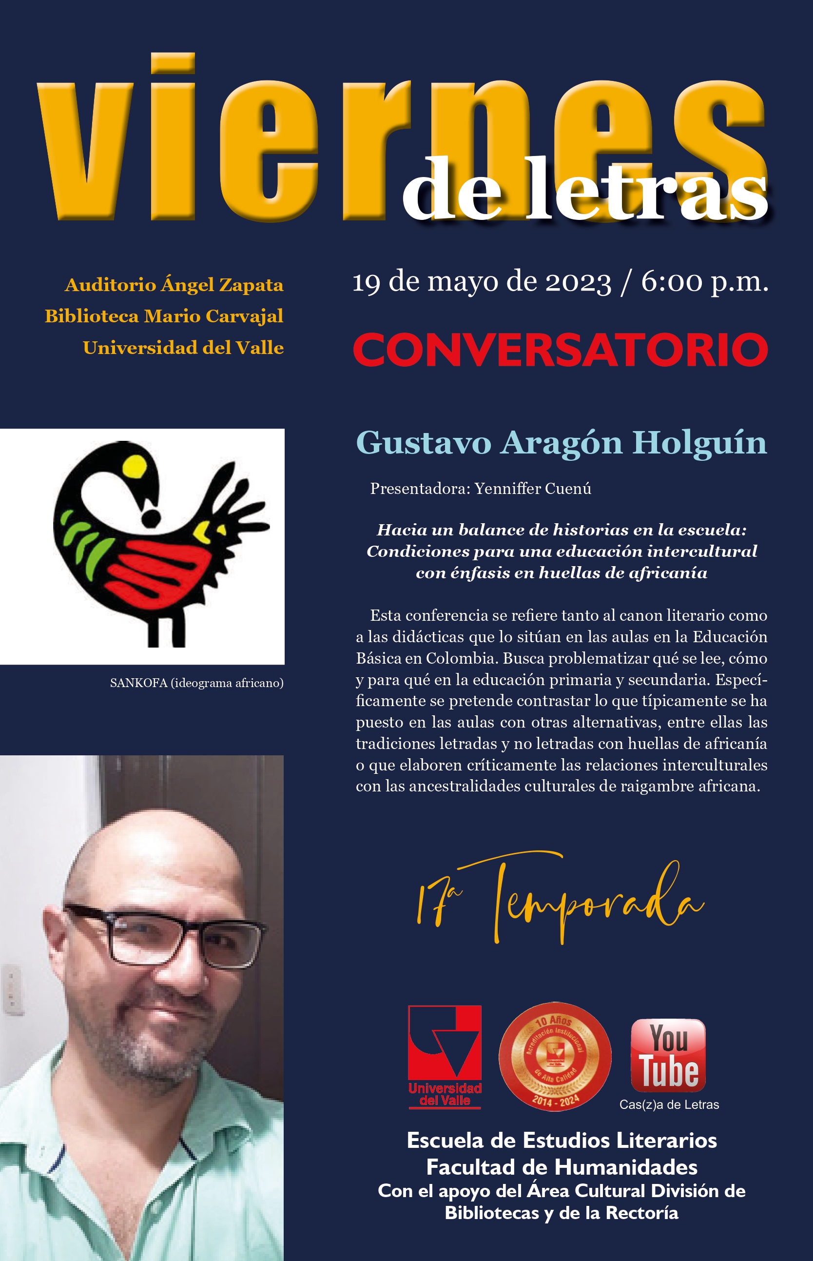 La Escuela de Estudios Literarios de la Facultad de Humanidades - Univalle invita al conversatorio, en el marco de Viernes de Letras, "Hacia un balance de historias en la escuela: condiciones para una educación intercultural con énfasis en huellas de africanía". Gustavo Aragón Holguín estará a cargo de esta presentación. La actividad se realizará el viernes 19 de mayo, 6:00 p.m., en el Auditorio Ángel Zapata.