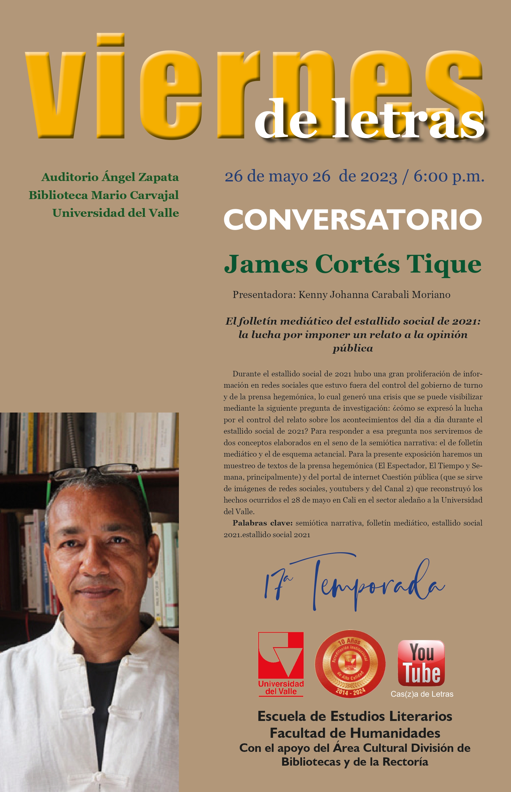 La Escuela de Estudios Literarios de la Universidad del Valle tiene el agrado de invitar al conversatorio El folletín mediático del estallido social de 2021: la lucha por imponer un relato a la opinión pública por el profesor James Cortés Tique en el marco de Viernes de Letras, programa de extensión de la Facultad de Humanidades que cuenta con el apoyo del Área Cultural División de Bibliotecas y de la Rectoría de la Universidad del Valle. La presentación de los invitados estará a cargo de la estudiante de nuestra Licenciatura en Literatura Kenny Johanna Carabali Moriano.