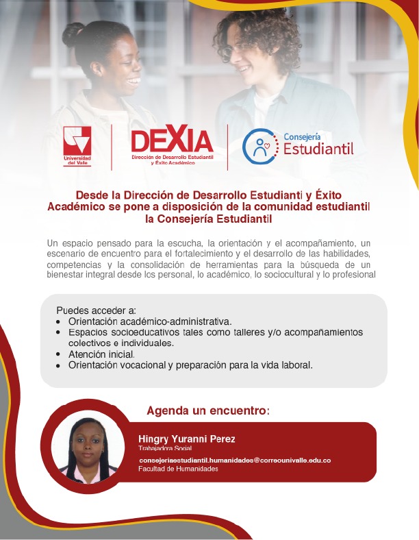 La Dirección de Desarrollo Estudiantil y Exito Académico de la Universidad del Valle presenta a la profesional de apoyo de la Consejería Estudiantil designada para los estudiantes de la Facultad de Humanidades, Hingry Yuranni Perez. Esto con el fin de que tengan conocimiento de este espacio de escucha y orientación y puedan hacer uso del mismo.