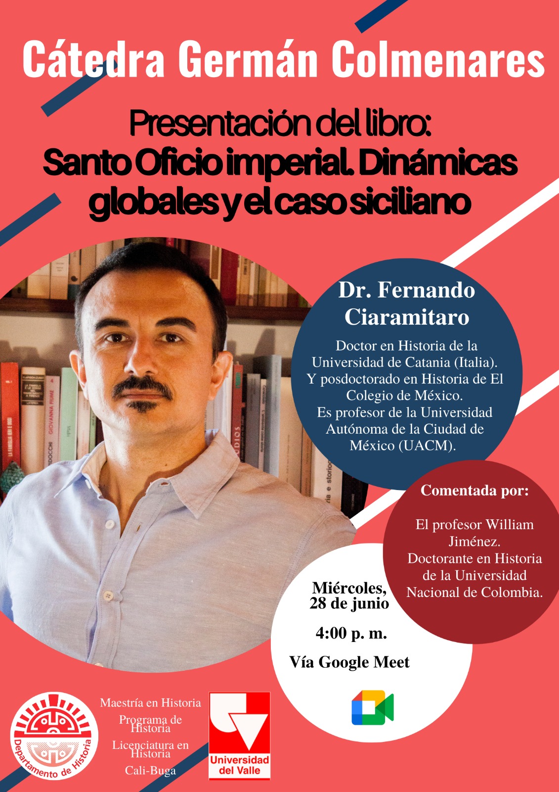 El Departamento de Historia de la Facultad de Humanidades de la Universidad del Valle se complace en invitarlos a la siguiente Cátedra Germán Colmenares. En esta ocasión se contará con la participación del Dr. Fernando Ciaramitaro, doctor en Historia de la Universidad de Catania (Italia) y posdoctorado en Historia de El Colegio de México; con la presentación del libro Santo Oficio imperial. Dinámicas globales y el caso siciliano.