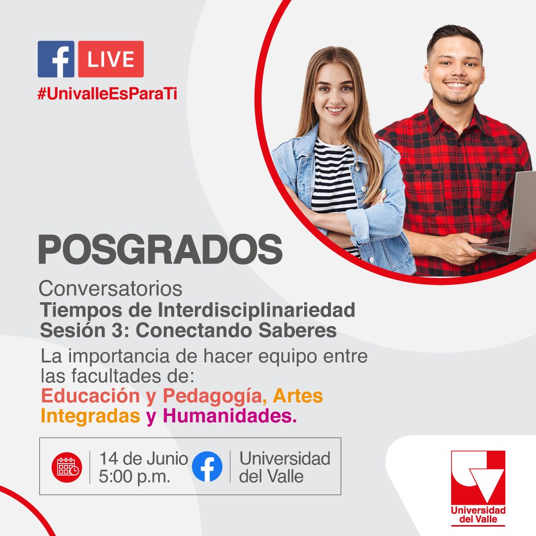 No te pierdas el cierre de nuestro ciclo de conversatorios acerca del trabajo Interdisciplinar en nuestros #PosgradosDeExcelencia. Conoce cómo nuestras facultades con su trabajo conjunto ayudan al avance de las artes, las humanidades y la educación. Tú también puedes volver a la academia para hacer parte de nuestros proyectos. #UnivalleEsparaTi