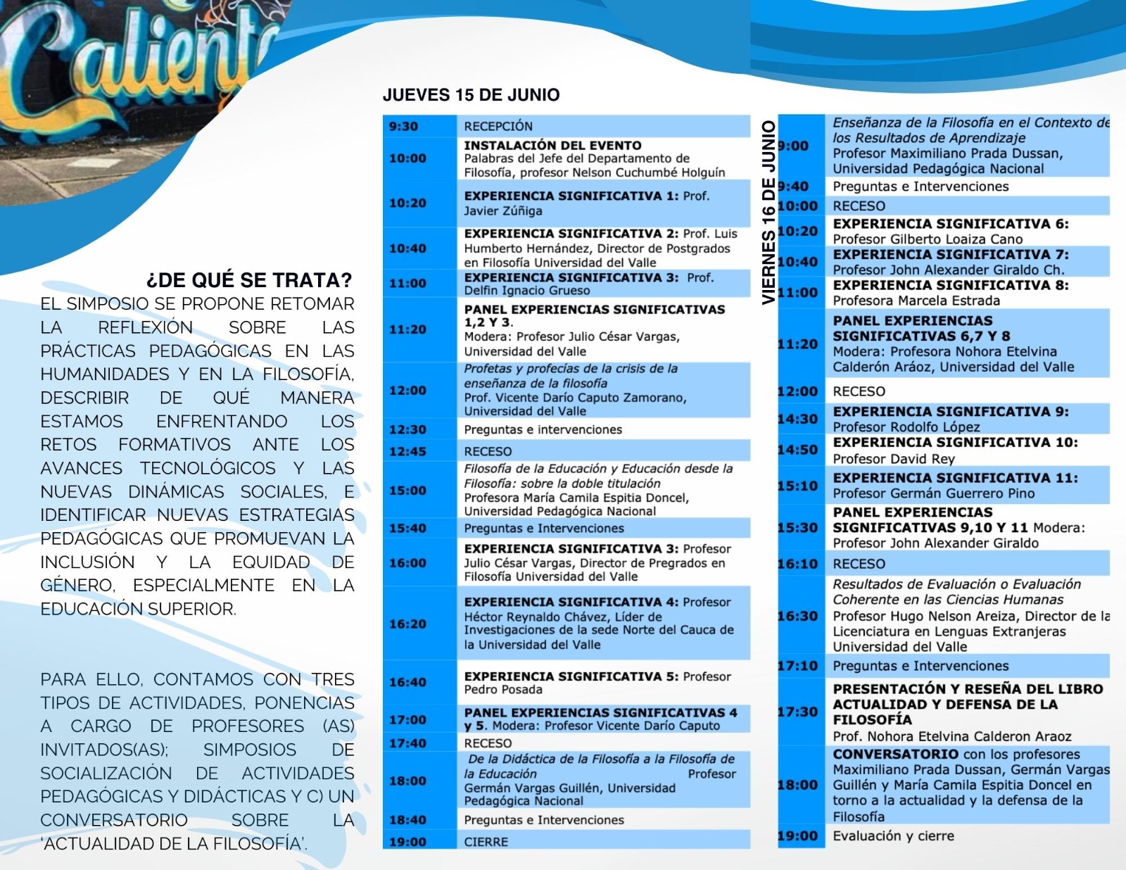Consciente de las transformaciones que ha generado el período de pandemia en la tecnología, en las relaciones sociales y en las prácticas académicas, el Departamento de Filosofía de la Universidad del Valle invita al “Simposio: Enseñanza de la Filosofía ante los retos Post-pandemia", que tendrá lugar los días 15 y 16 de junio de 2023, en el auditorio Germán Colmenares (Edificio D10/386).