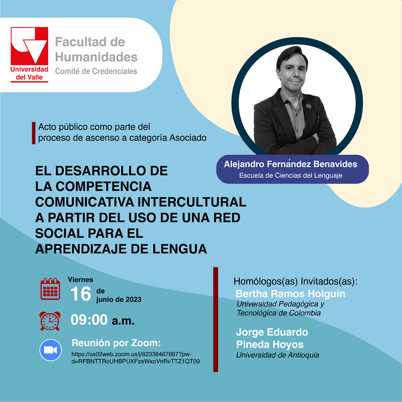 El Comité de Credenciales de la Facultad de Humanidades de la Universidad del Valle invita al acto público como parte del proceso de ascenso a Categoría Asociado del profesor Alejandro Fernández Benavides de la Escuela de Ciencias del Lenguaje. El tema a disertar es "Desarrollo de la competencia comunicativa intercultural a partir del uso de una red social para el aprendizaje de lengua". Los homólogos (as) invitados (as) son la profesora Bertha Ramos Holguín de la Universidad Pedagógica y Tecnológica de Colombia (Tunja) y el profesor Jorge Eduardo Pineda Hoyos de la Universidad de Antioquia (Medellín).