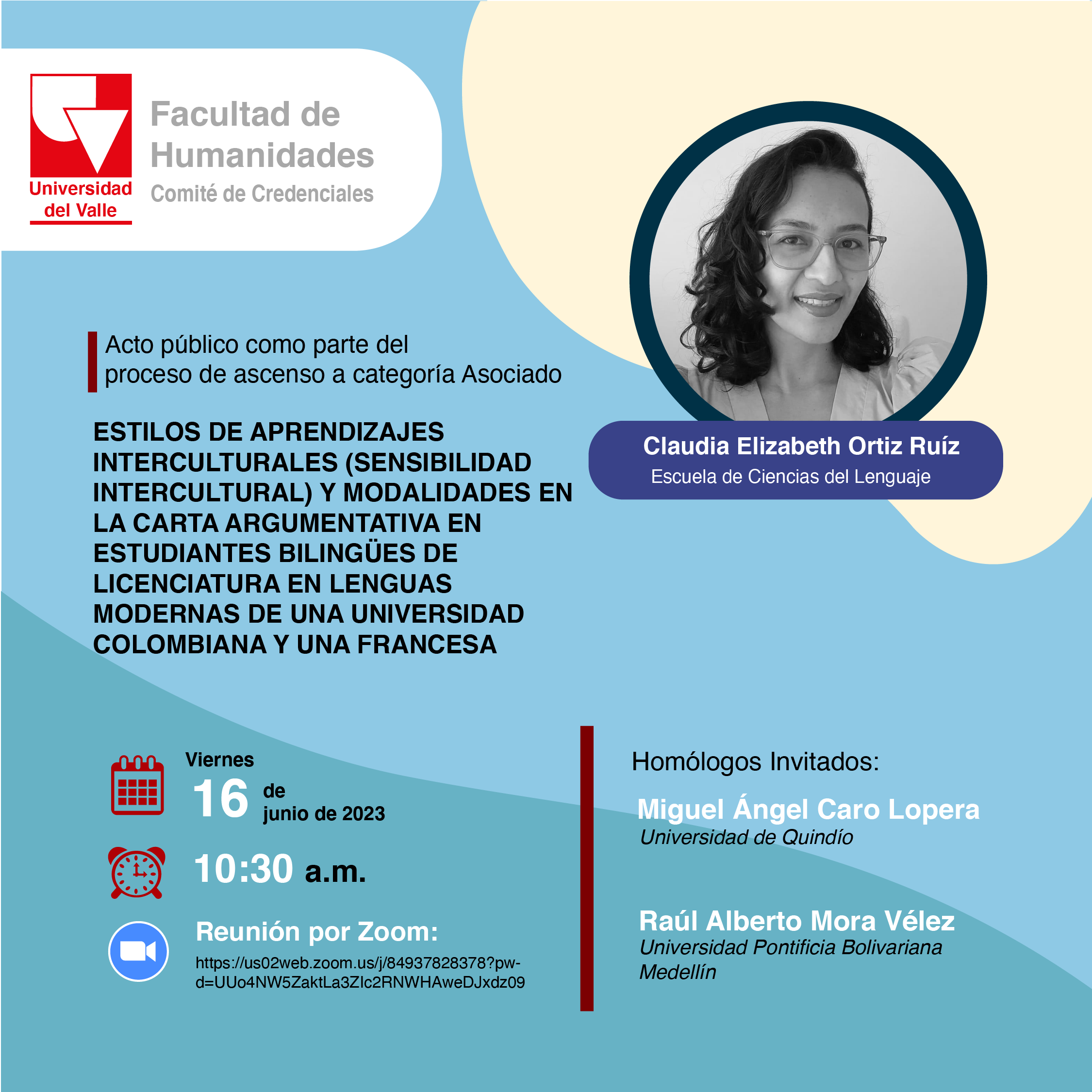 El Comité de Credenciales de la Facultad de Humanidades de la Universidad del Valle invita al acto público como parte del proceso de ascenso a Categoría Asociado de la profesora Claudia Elizabeth Ortiz Ruiz de la Escuela de Ciencias del Lenguaje. El tema a disertar es "Estilos de aprendizaje interculturales (sensibilidad intercultural) y modalidades en la carta argumentativa en estudiantes bilingües de licenciatura en lenguas modernas de una universidad colombiana y una francesa". Los homólogos invitados son el profesor Miguel Ángel Caro Lopera de la Universidad del Quindío y el profesor Raúl Alberto Mora Vélez de la Universidad Pontificia Bolivariana.