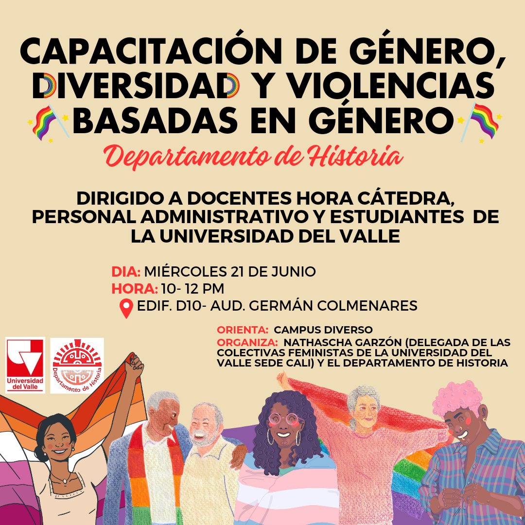 El Departamento de Historia de la Facultad de Humanidades y la delegada de las colectivas feministas y de género de la Universidad del Valle sede Cali ante la mesa de género y diversidad sexual se complacen en invitar a la comunidad universitaria al evento Capacitación de género, diversidad y violencias basadas en género que se llevará a cabo el miércoles 21 de junio de 10 am a 12 pm en el Edif. D10. Auditorio Germán Colmenares en orientación de Campus Diverso.