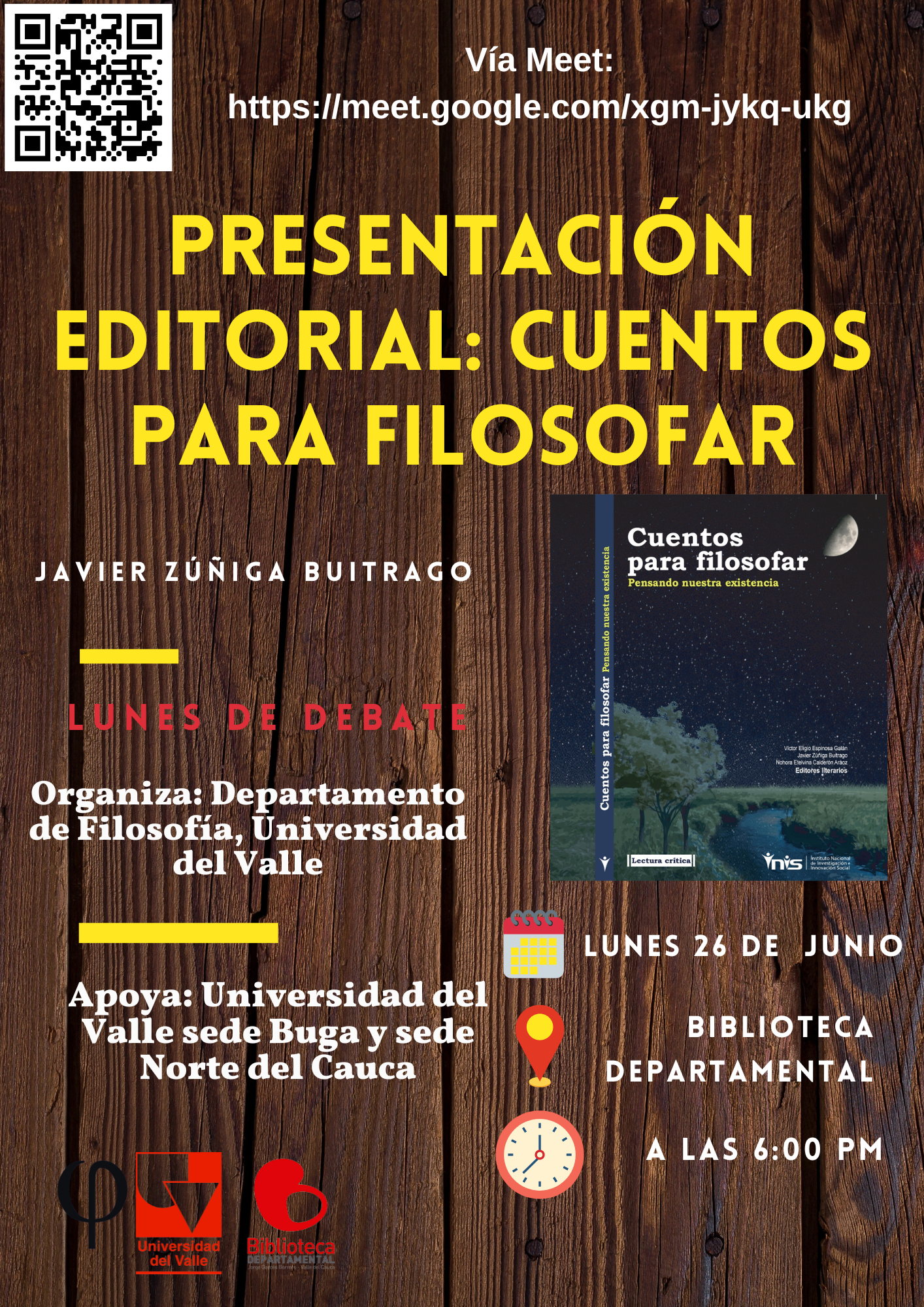 El Departamento de Filosofía de la Facultad de Humanidades de la Universidad del Valle Invita a la comunidad en general a participar en el programa de extensión Lunes de Debate. Filosofía en la Ciudad. En esta ocasión se realizará la presentación editorial del libro Cuentos para filosofar: pensando nuestra existencia a cargo de Javier Zúñiga Buitrago. El evento tendrá lugar el lunes 26 de junio de 2023 a las 6:00 p.m. en la Biblioteca Departamental Jorge Garcés Borrero (Cl. 5 #24A-91).