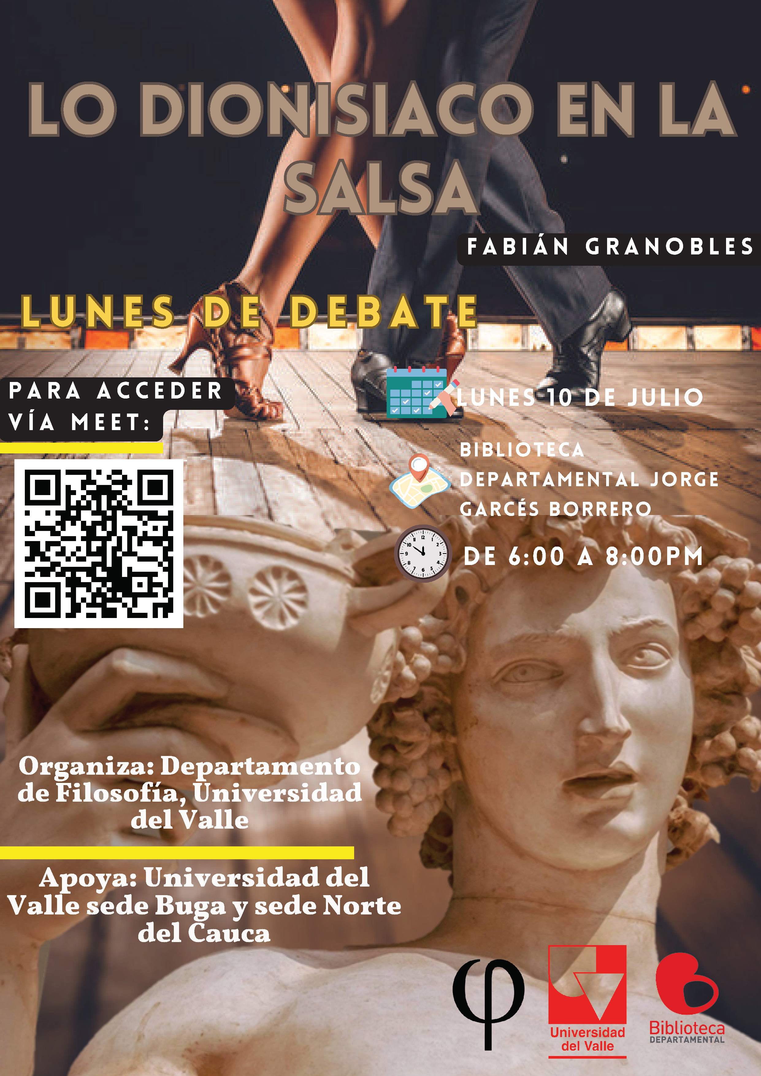 El Departamento de Filosofía de la Facultad de Humanidades de la Universidad del Valle Invita a la comunidad en general a participar en el programa de extensión Lunes de Debate. Filosofía en la Ciudad. En esta ocasión se abordará el tema de Lo Dionisiaco en la Salsa y la discusión estará a cargo del profesor Fabián Granobles. El evento tendrá lugar el lunes 10 de julio de 2023 a las 6:00 p.m. en la Biblioteca Departamental Jorge Garcés Borrero (Cl. 5 #24A-91).