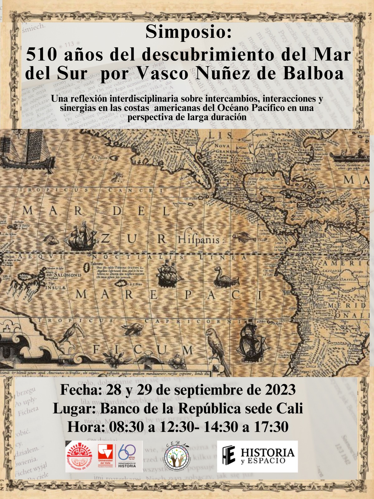 El Departamento de Historia de la Facultad de Humanidades de la Universidad del Valle, y en particular el Centro de Estudios Históricos y Ambientales (CEHA) realizará los días 28 y 29 de septiembre, en las instalaciones del Banco de la República, el simposio interdisciplinario denominado “510 años del descubrimiento de la Mar del Sur por Vasco Nuñez de Balboa. Una reflexión interdisciplinaria sobre intercambios, interacciones y sinergias en las costas americanas del océano Pacífico en una perspectiva de larga duración”.