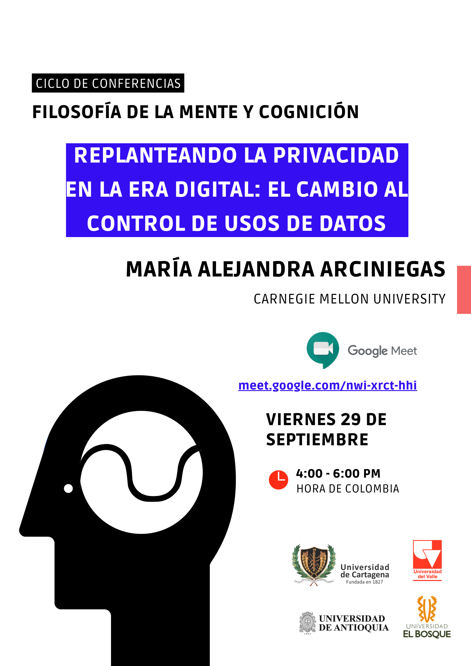 Nos complace informar que la próxima conferencia del ciclo Filosofía de la mente y cognición se llevará a cabo este viernes 29 de septiembre de las 4:00 p.m. a las 6:00 p.m. (hora de Colombia). En esta ocasión, la conferencista será María Alejandra Arciniegas de Carnegie Mellon University. Su conferencia se titula «Replanteando la privacidad en la era digital: El cambio al control de Usos de Datos».