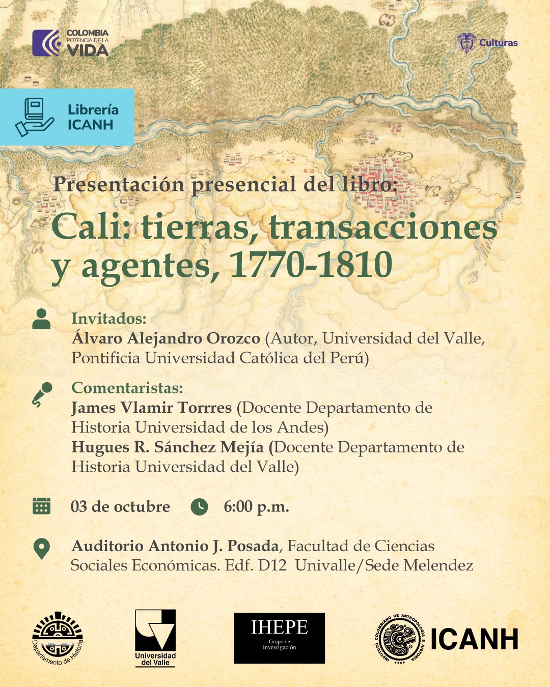 El Departamento de Historia de la Facultad de Humanidades de la Universidad del Valle, el Instituto Colombiano de Antropología e Historia y el grupo de investigación IHEPE (Investigaciones Históricas en Economía, Política y Educación) invitan a la presentación del libro Cali: tierras, transacciones y agentes, 1770-1810, de Álvaro Alejandro Orozco. Los comentaristas invitados son los profesores James Vladimir Torres (Universidad de los Andes) y Hughes R. Sánchez Mejía (Universidad del Valle).