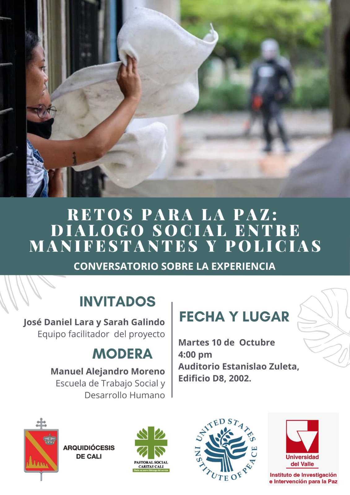 El Instituto de Investigación e intervención para la paz de la Universidad del Valle invita al conversatorio "Retos para la paz: Diálogo social entre manifestantes y policías" que tendrá lugar el martes 10 de octubre a las 4:00 p.m. en el auditorio Estanislao Zuleta del edificio D8. Los invitados son José Daniel Lara y Sarah Galindo. Quien moderará el evento será el profesor de la Escuela de Trabajo Social y Desarrollo Humano, Manuel Alejandro Moreno.