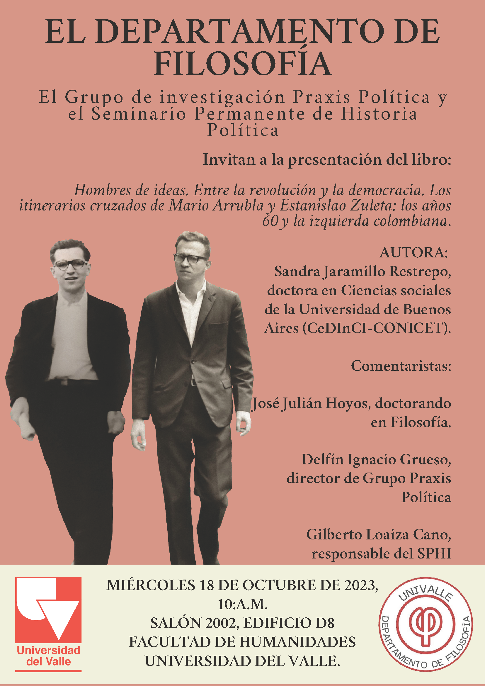 El Grupo de Investigación Praxis Política y el Seminario Permanente de Historia Política invitan a la presentación del libro Hombres de ideas. Entre la revolución y la democracia. Los itinerarios cruzados de Mario Arrubla y Estanislao Zuleta: los años 60 y la izquierda colombiana, escrito por Sandra Jaramillo Restrepo (doctora en Ciencias Sociales de la Universidad de Buenos Aires (CeDInCI-CONICET). El libro será comentado por los profesores Delfín Ignacio Grueso (director del Grupo Praxis Política), Gilberto Loaiza Cano (responsable del SPHI), y José Julián Hoyos (doctorando en Filosofía). La actividad académica se realizará el miércoles 18 de octubre de 2023, las 10:00 a.m. en el salón 2002 Edificio D8, Facultad de Humanidades.