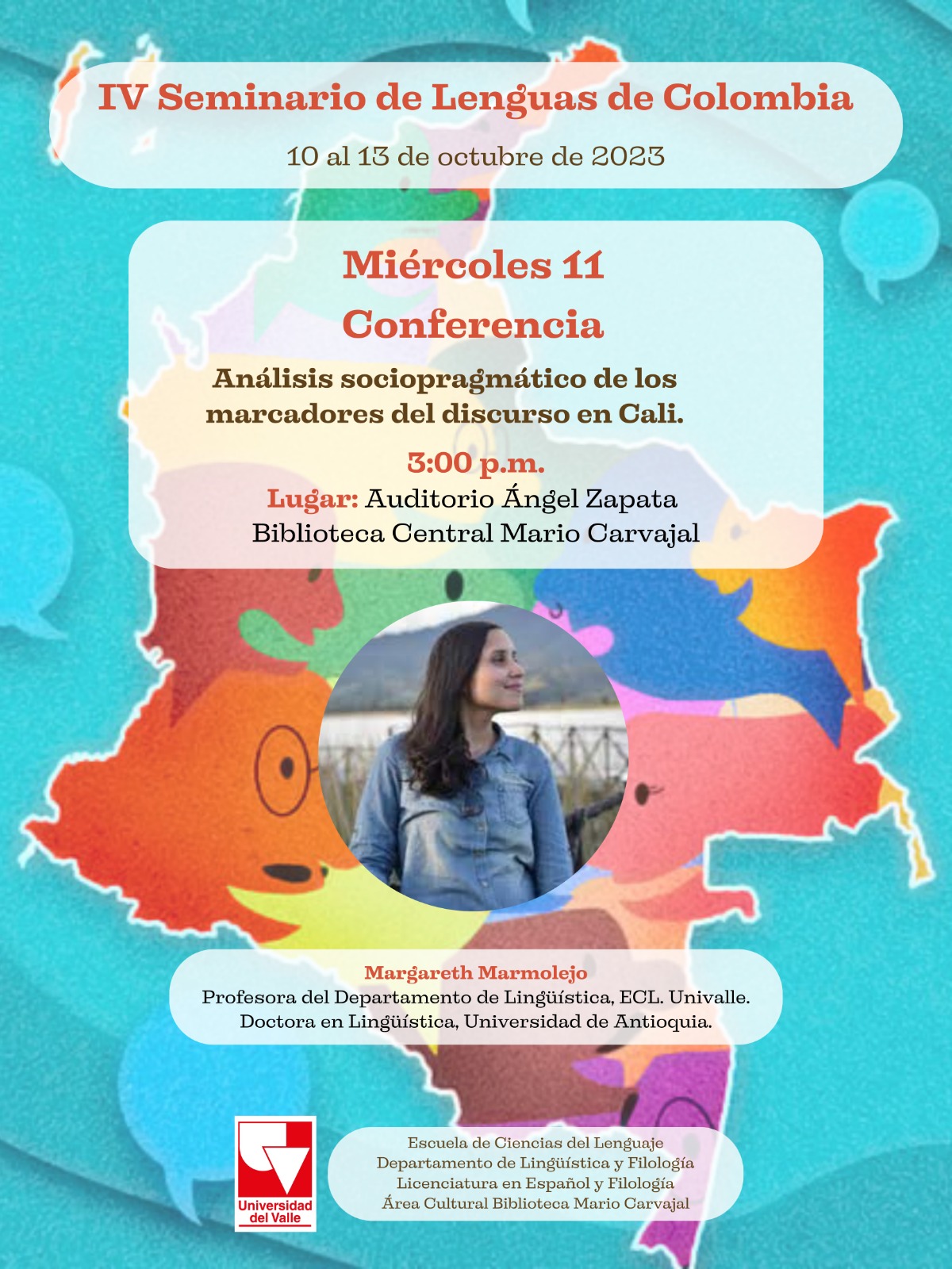 En el marco del IV Seminario de Lenguas de Colombia se llevará a cabo el día de hoy miércoles 11 de octubre la conferencia "Análisis sociopragmático de los marcadores del discurso en Cali", dictada por la profesora Margareth Marmolejo. La actividad se realizará a las 3:00 p.m. en el Auditorio Ángel Zapata/Biblioteca Central Mario Carvajal.