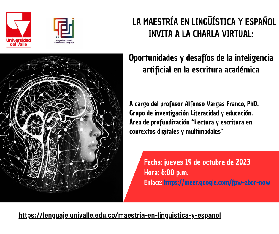 La Maestría en Lingüística y Español de la Escuela de Ciencias del Lenguaje se complace en invitar a la charla virtual "Oportunidades y desafíos de la inteligencia artificial en la escritura académica", a cargo del profesor Alfonso Vargas Franco, PhD.