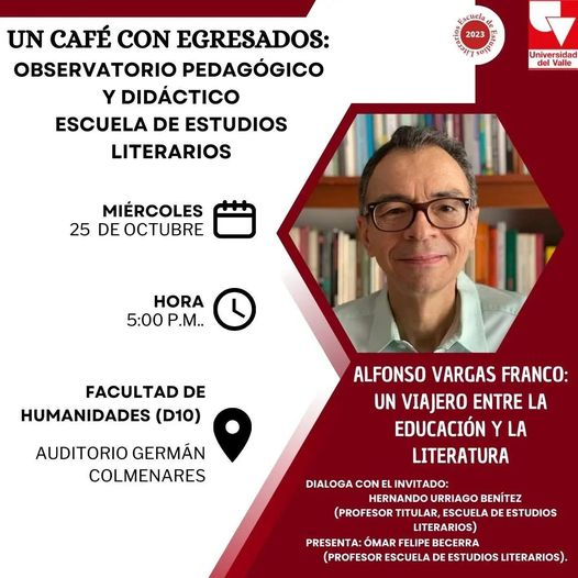 Desde la coordinación del programa de Proyección Social UN CAFÉ CON EGRESADOS: Observatorio Pedagógico y Didáctico de la Escuela de Estudios Literarios de la Facultad de Humanidades de la Universidad del Valle extendemos cordial invitación para asistir al coloquio de homenaje con el profesor Alfonso Vargas Franco el próximo miércoles 25 de octubre a las 17:00 en el Auditorio Germán Colmenares.