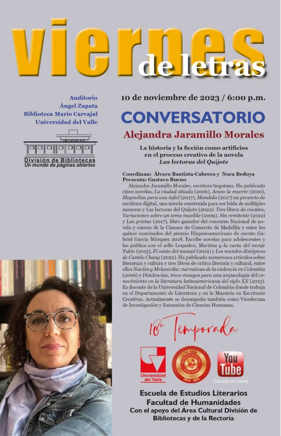 La Escuela de Estudios Literarios de la Facultad de Humanidades de la Universidad del Valle tiene el agrado de invitar al conversatorio "La historia y la ficción como artificios en el proceso creativo de la novela: Las lectoras del Quijote" con la escritora Alejandra Jaramillo Morales. Este será el quinto y último conversatorio de la temporada 18 de Viernes de Letras, programa de extensión de nuestra unidad académica que cuenta con el apoyo del Área Cultural División de Bibliotecas y de la Rectoría de la Universidad del Valle. Les esperamos.