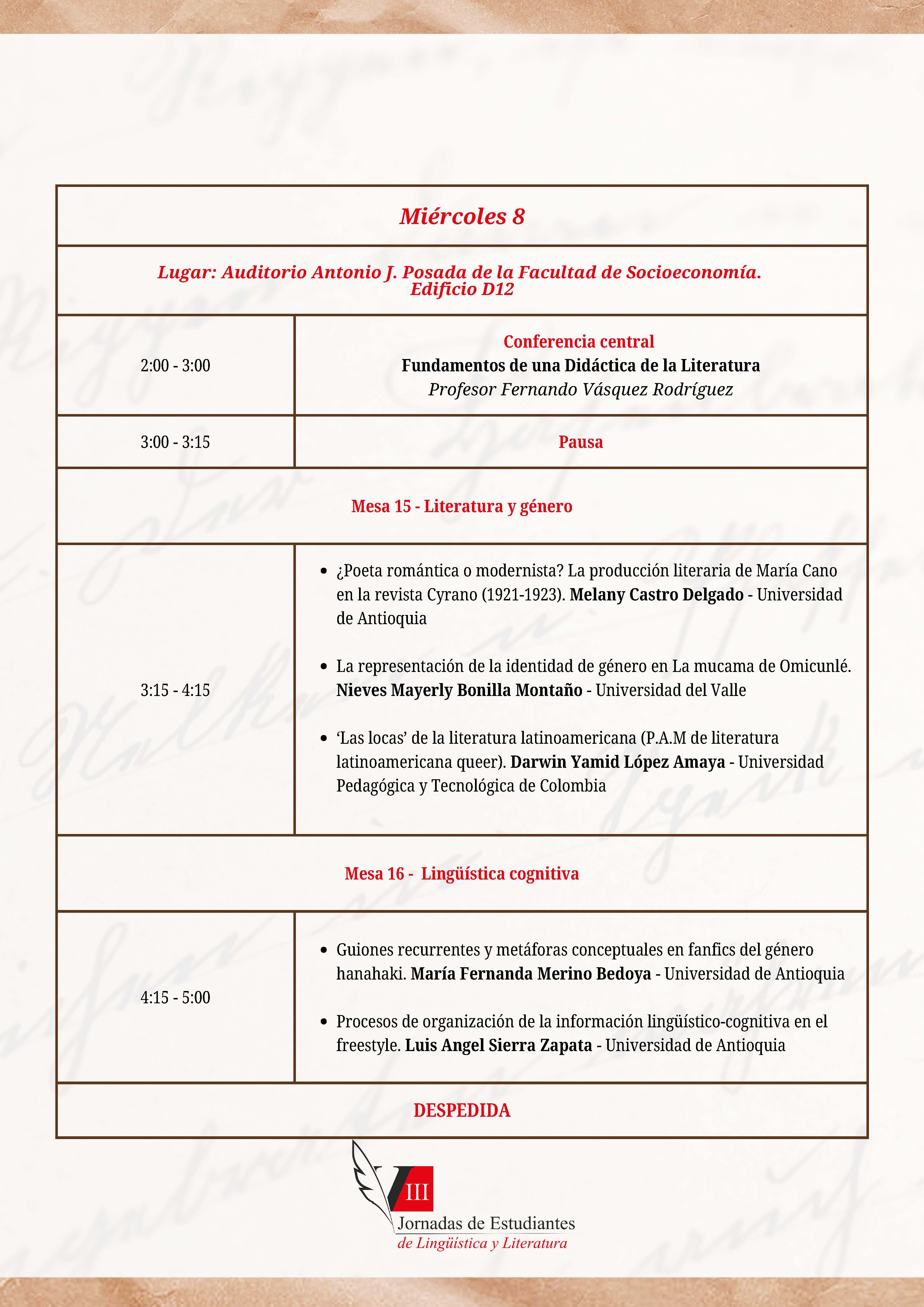 La Escuela de Ciencias del Lenguaje de la Facultad de Humanidades de la Universidad del Valle tiene el gusto de invitarlos a las próximas Jornadas de Estudiantes de Lingüística y Literatura que se llevarán a cabo del 7 al 10 de noviembre en la Universidad , organizadas por Departamento de Lingüística y Filología, el programa de Licenciatura en Español y Filología, y la Maestría en Lingüística y Español. Contaremos con invitados Internacionales y Nacionales.