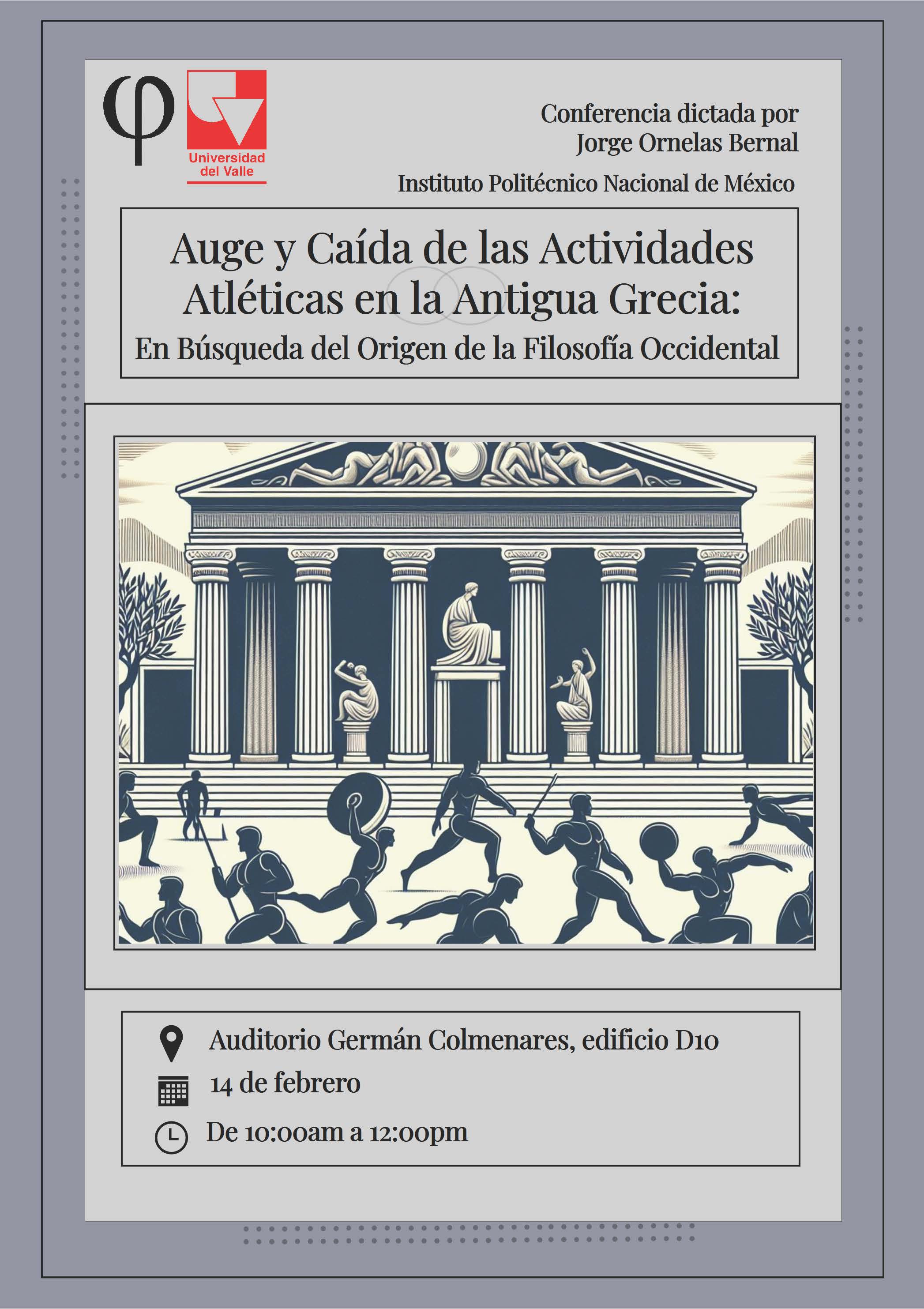 El Departamento de Filosofía invita a la conferencia "Auge y Caída de las actividades atléticas en la Antigua Grecia. En búsqueda del origen de la filosofía Occidental", a cargo del profesor Jorge Ornelas PhD. La conferencia se realizará el 14 de febrero, a las 10:00 a.m. en el Auditorio Germán Colmenares, Edificio D-10.