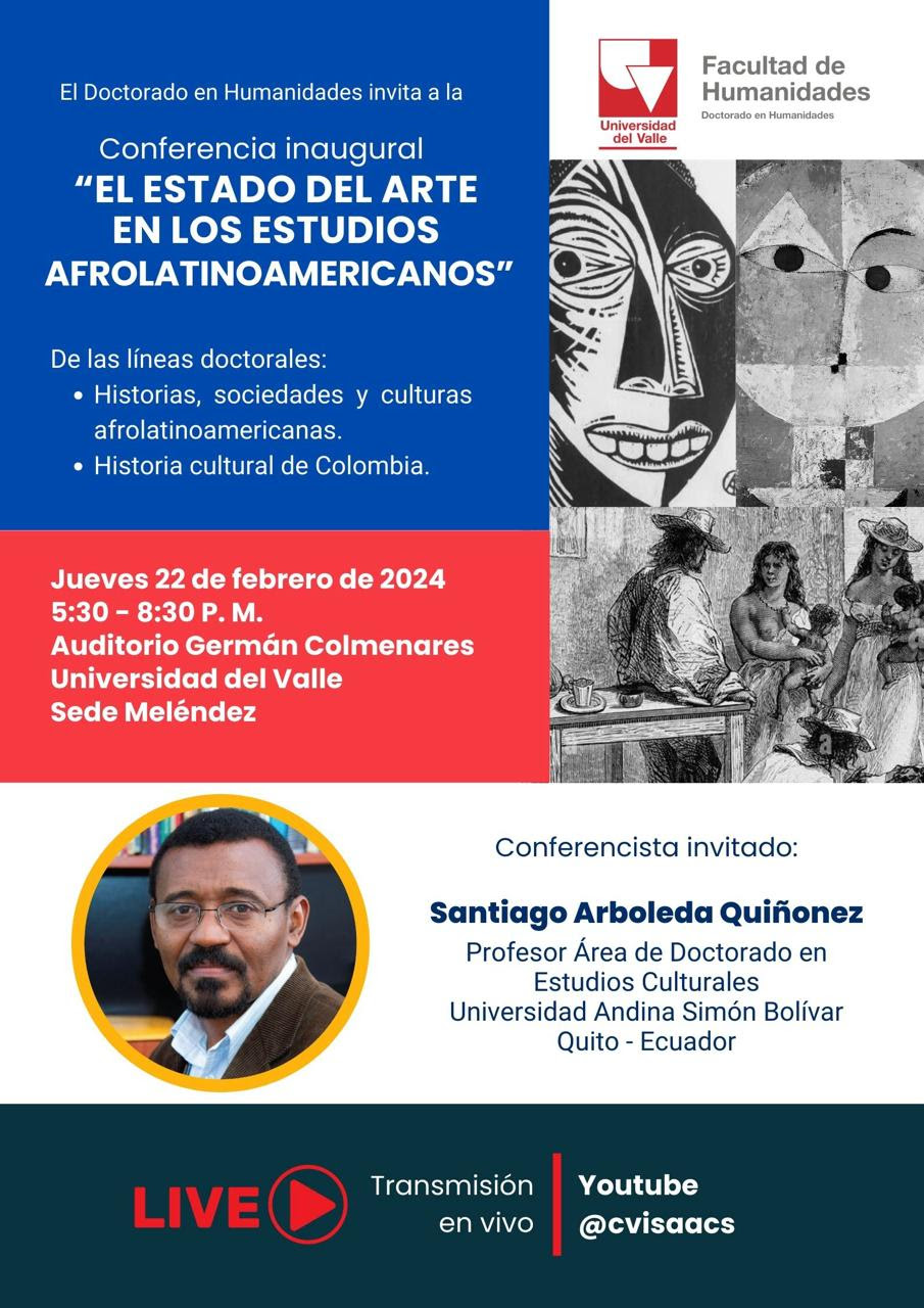 Las líneas doctorales Historia, sociedades y culturas afrolatinoamericanas e Historia cultural de Colombia del Doctorado en Humanidades de la Universidad del Valle Colombia invitan a la conferencia inaugural "El estado del arte en los estudios latinoamericanos". El conferencista invitado es el profesor Santiago Arboleda Quiñonez Ph.D., (Área de Doctorado en Estudios Culturales de la Universidad Andina Somón Bolívar, Quito, Ecuador). La actividad académica se realizará el jueves 22 de febrero de 2024 a las 5:30 p.m., en el Auditorio Germán Colmenares, Edificio D 10 Facultad de Humanidades, sede Meléndez.