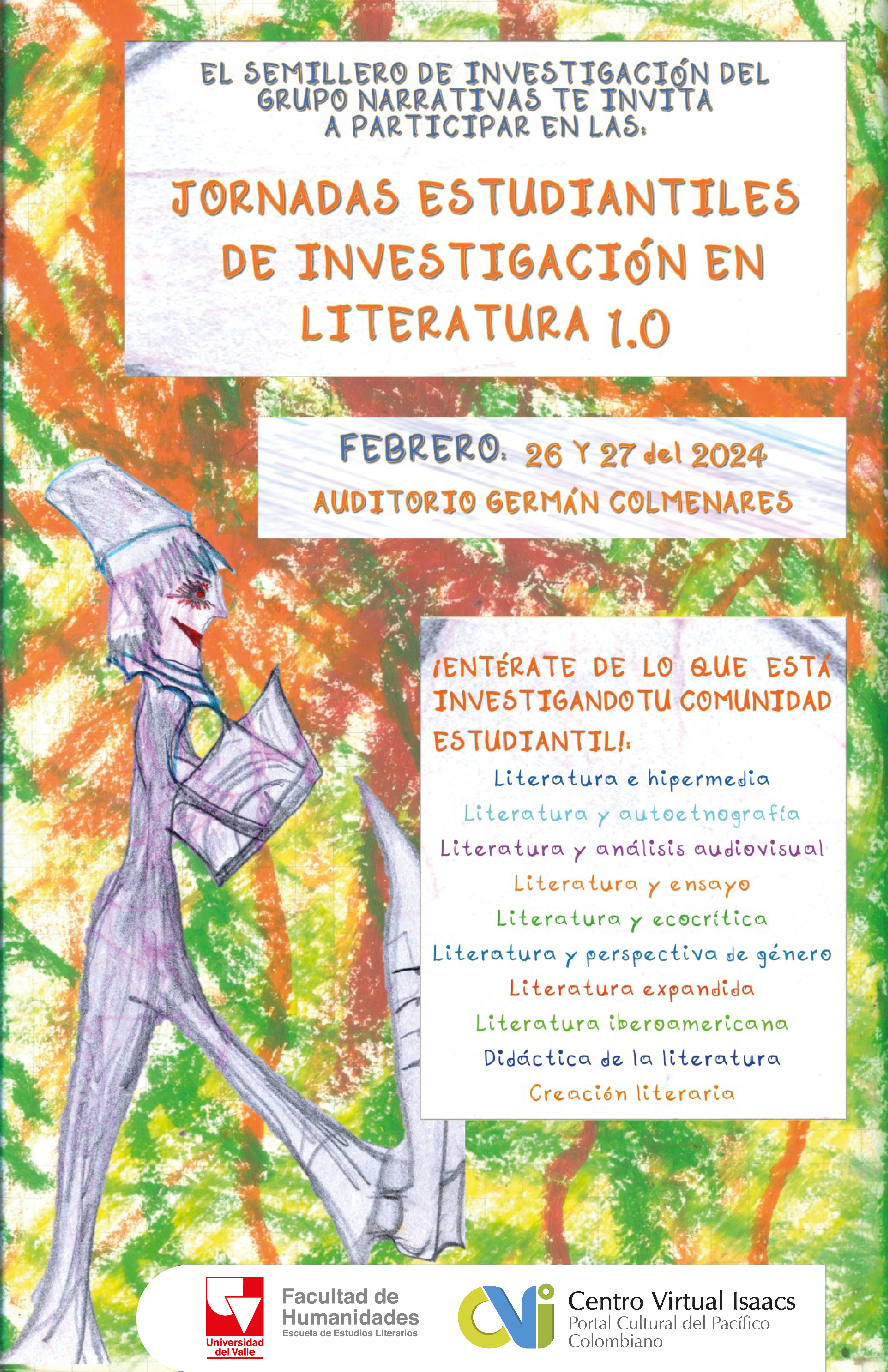 Los invitamos a participar en las primeras jornadas de estudiantiles de investigación en literatura 1.0 como resultado de la primera etapa de constitución del Semillero de investigación del grupo Narrativas de la Escuela de Estudios Literarios de la Facultad de Humanidades.