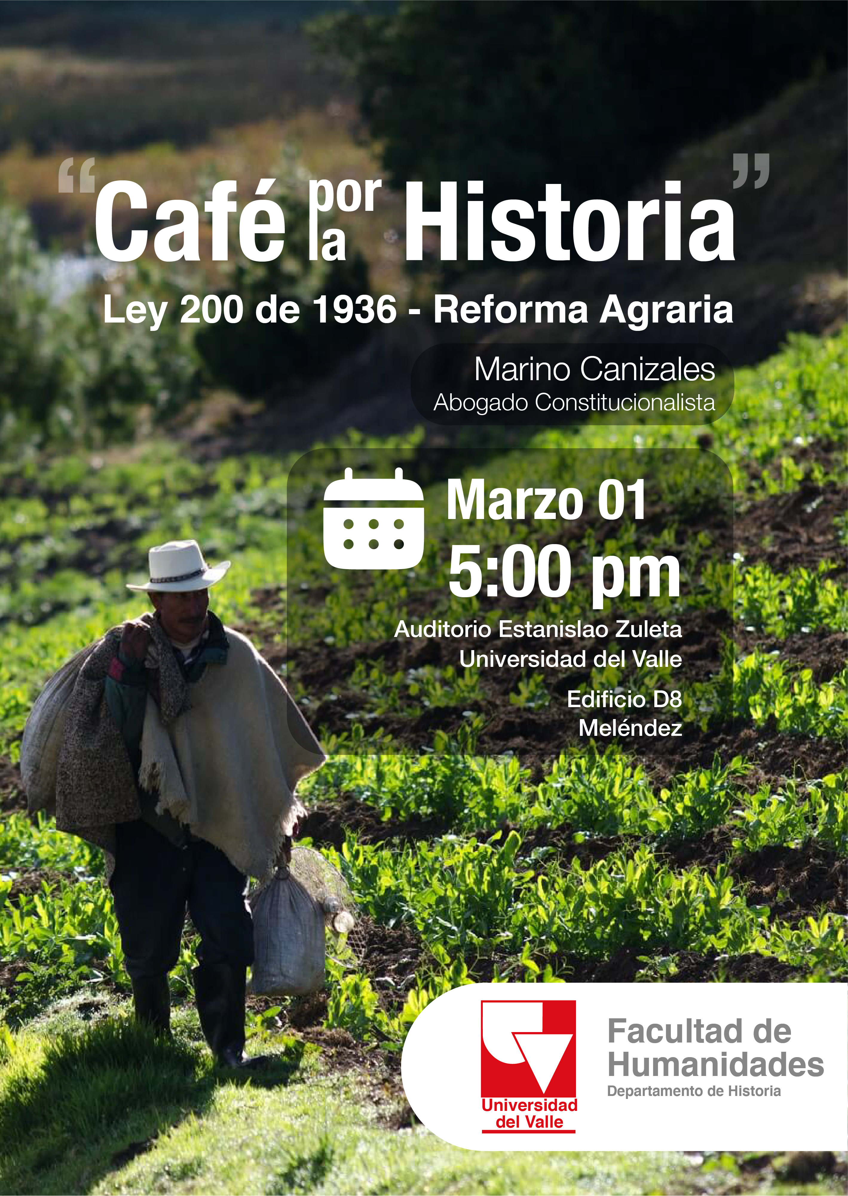 El Departamento de Historia de la Facultad de Humanidades invita a su "Café por la Historia" del 01 de marzo. En esta ocasión Marino Canizales, abogado constitucionalista, presentará la conferencia "Ley 200 de 1936 - Reforma agraria".